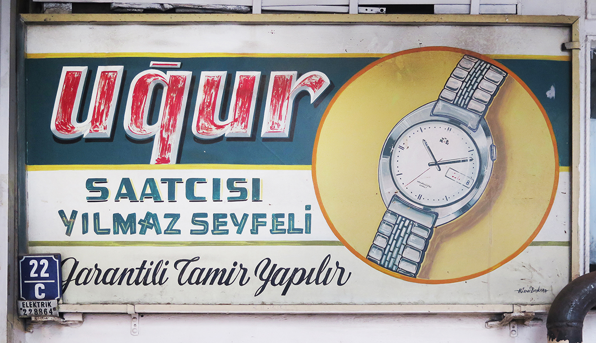 Uğur Saatçısı / Good Luck (Name) Watchmaker, Ankara. Commercial sign. Signed by Uğur Baykara.