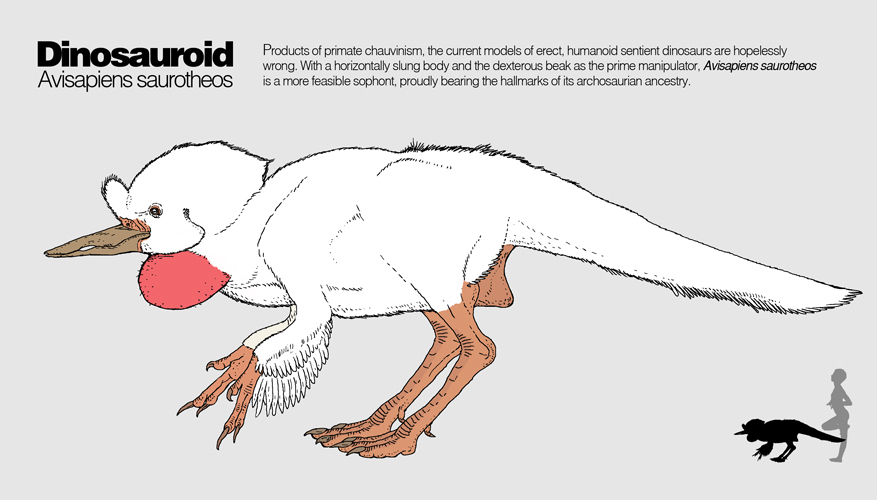 Zoologist Darren Naish's article about the possible evolution of intelligence in birds and/or dinosaurs. Features my concept of Avisapiens, a realistic, intelligent "dinosauroid," that looks more like a bird than a stock-image reptilian.
