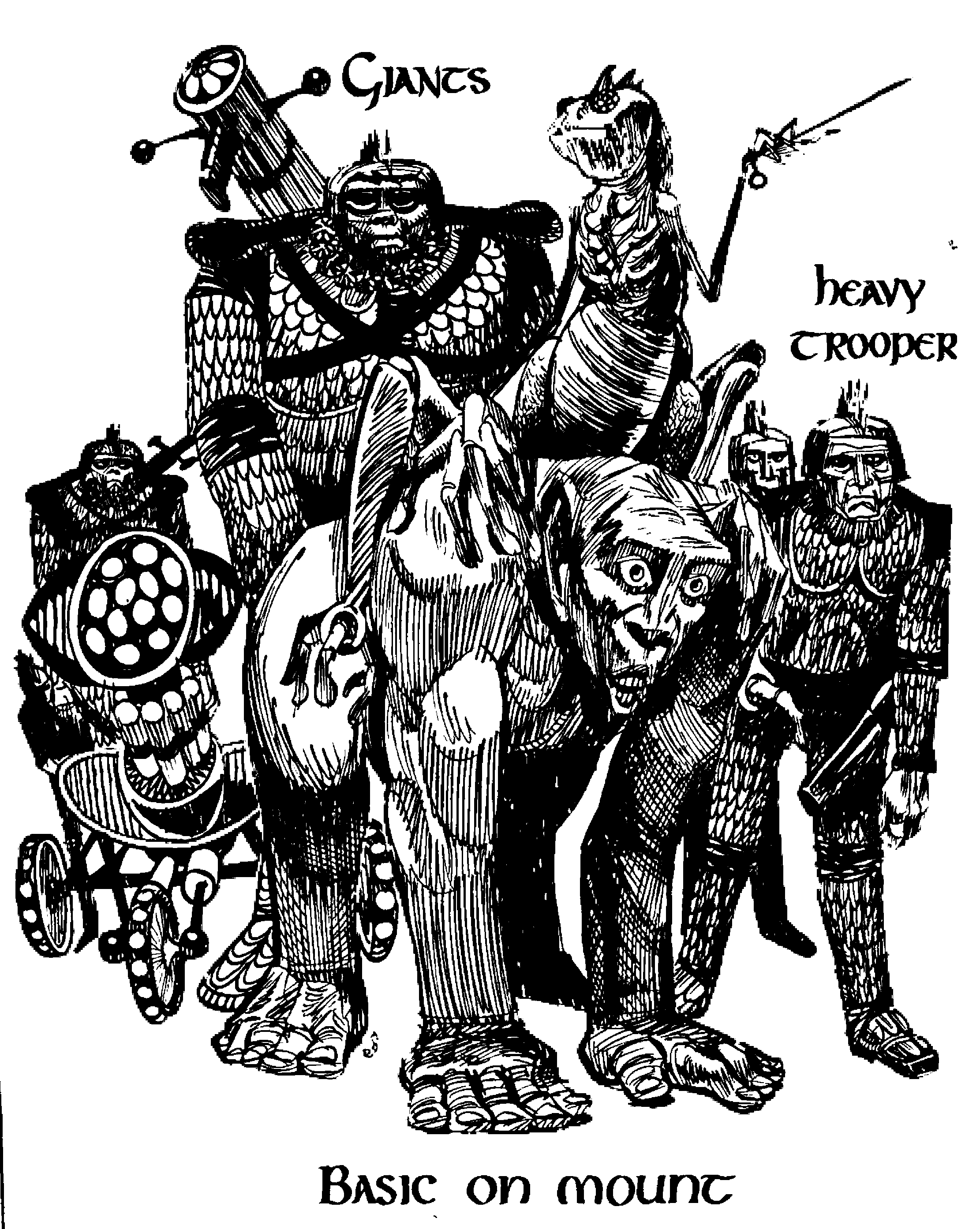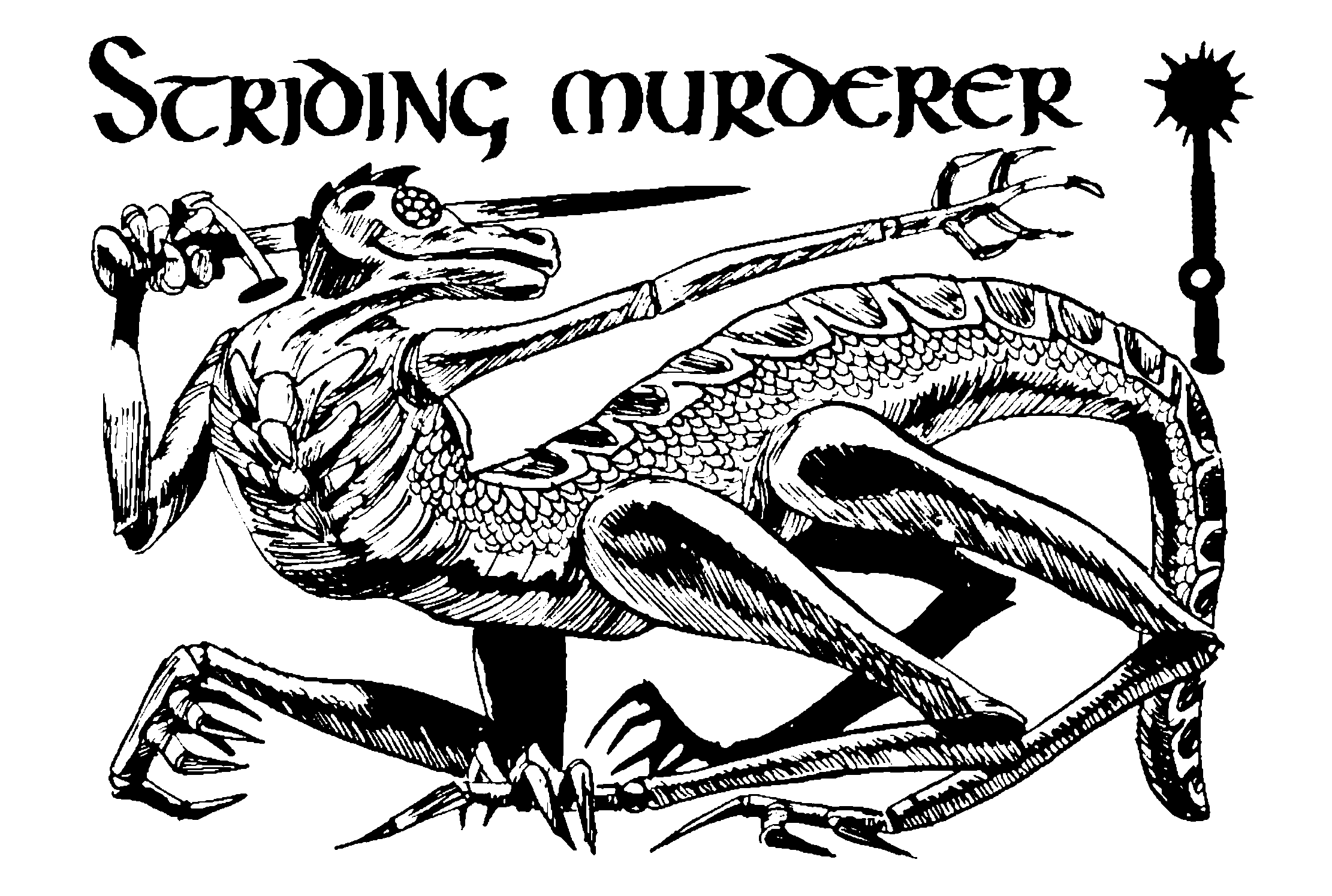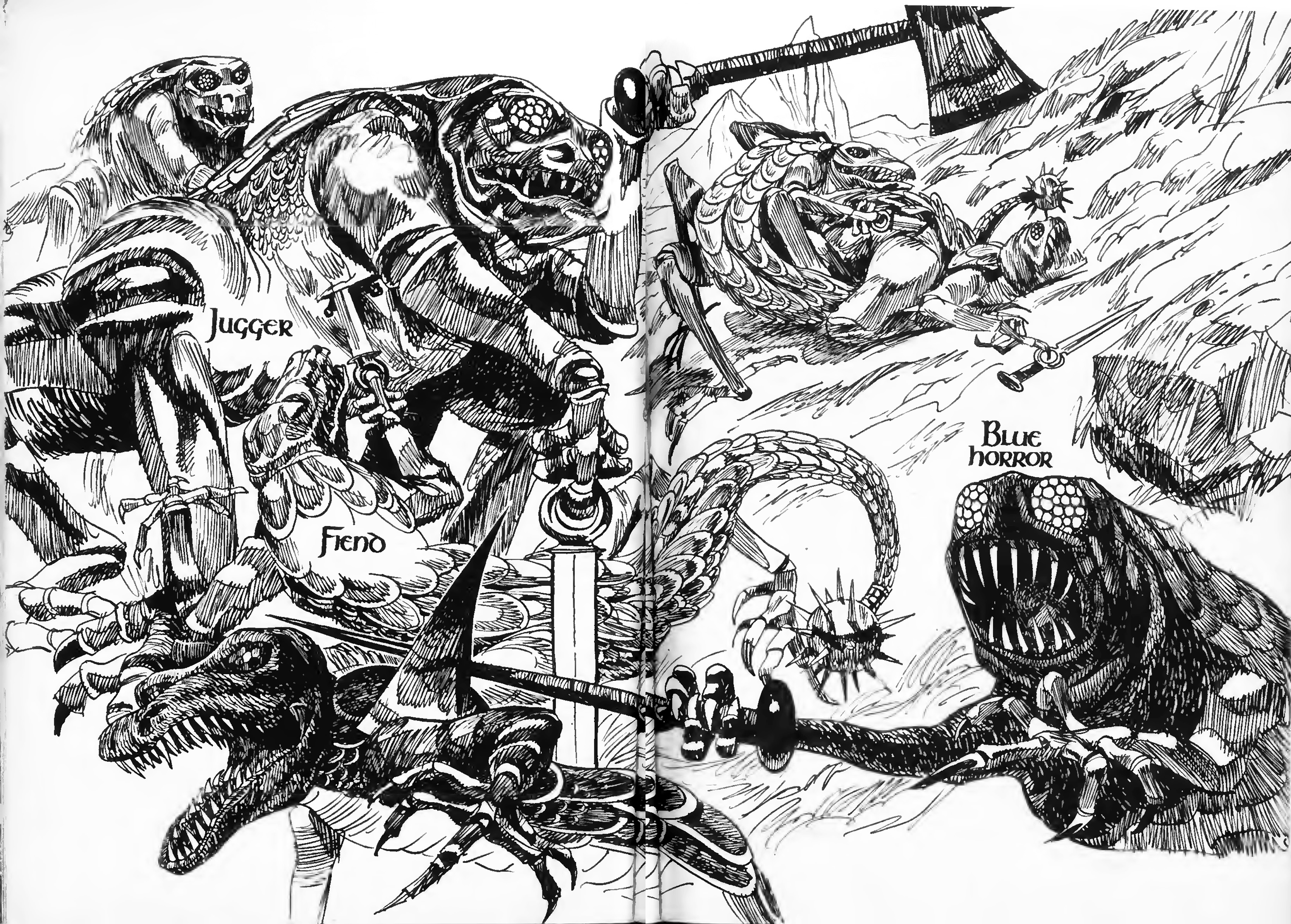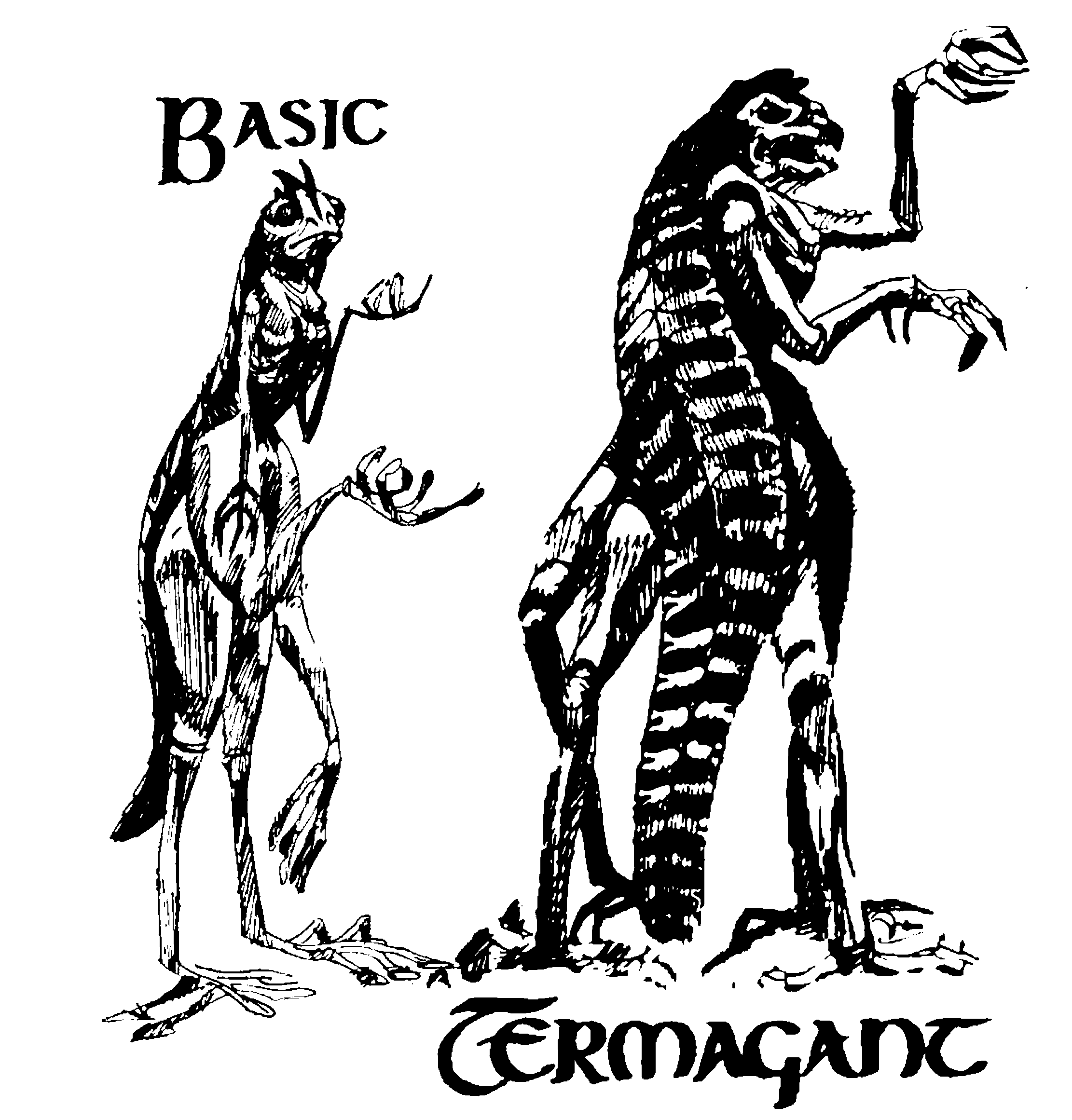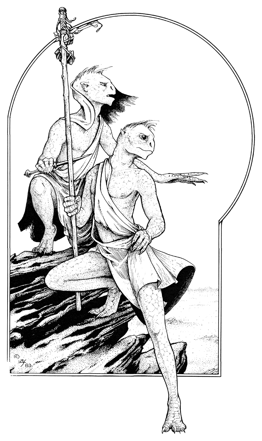 Two warriors of the reptile-like Agaman race; a member of the arboreal Hanging People race.