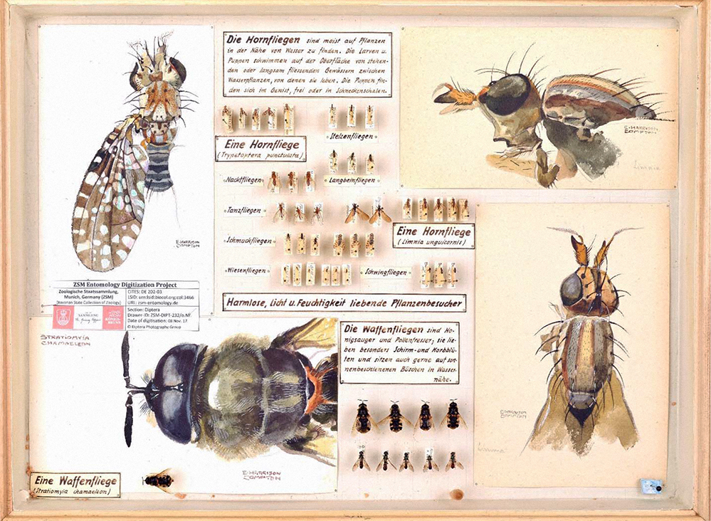 Source: Marion Kotrba, “Gems from the H. Fischer collection: Diptera watercolors by E. H. Compton and a syntype of Pegesimallus teratodes (Hermann, 1906) (Asilidae)”, Fly Times, Issue 61, October 2018, pp. 28-36.
