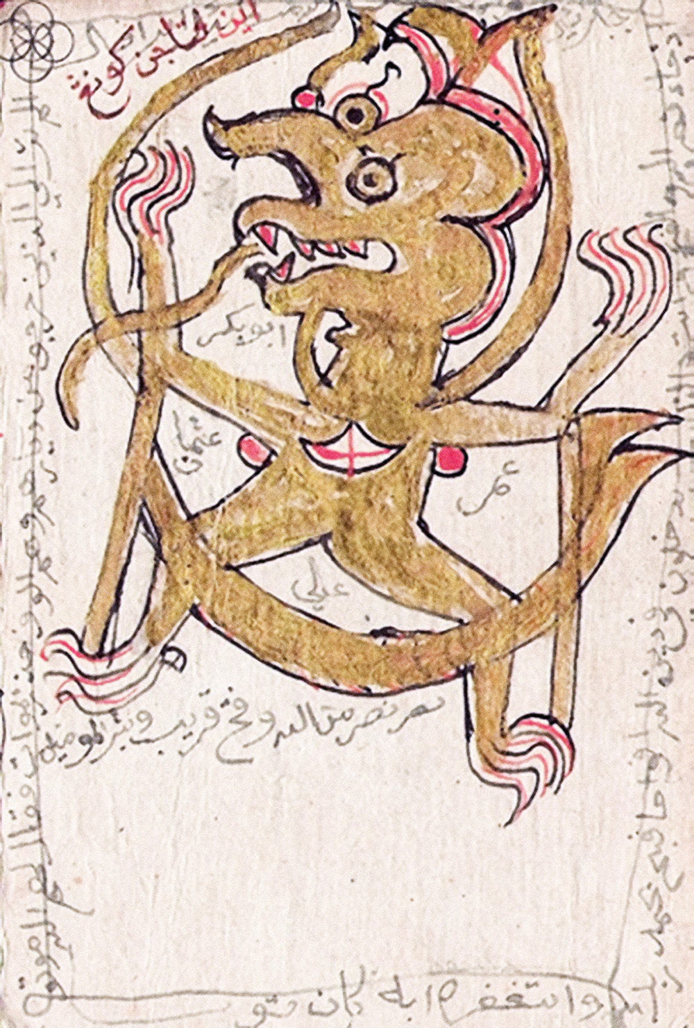 A selection of inscribed figures from Middle-Eastern incantation bowls, ritual objects from the Late Antiquity. These bowls were believed to trap evil spirits when buried as part of special rituals. Jews, Christians, Mandaeans, Manichaeans, Zoroastrians and Early Moslems all used them.