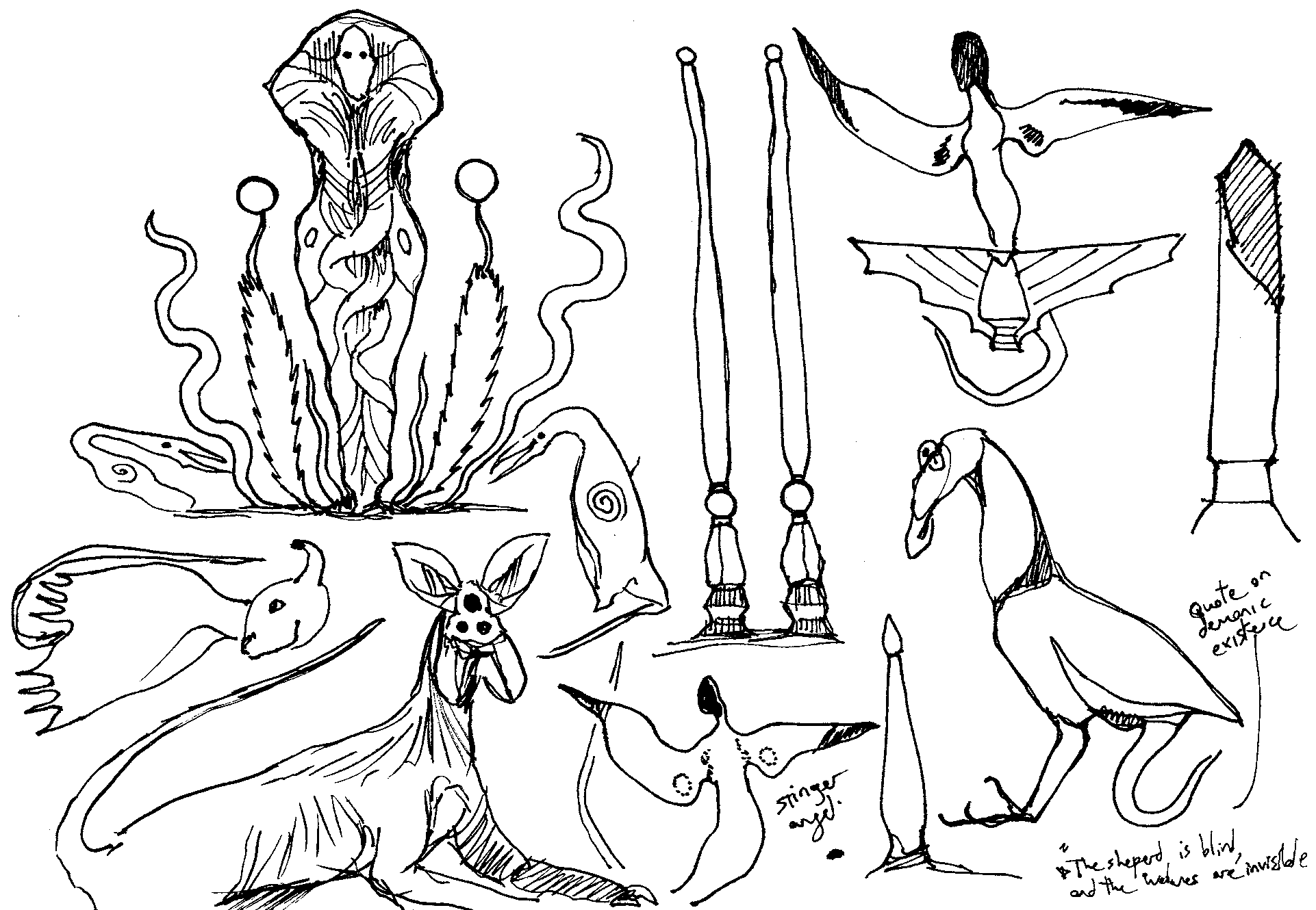 Sketches of winged humanoid creatures.