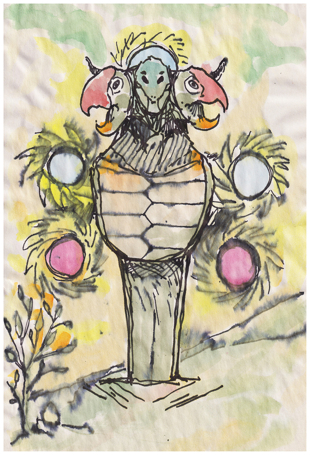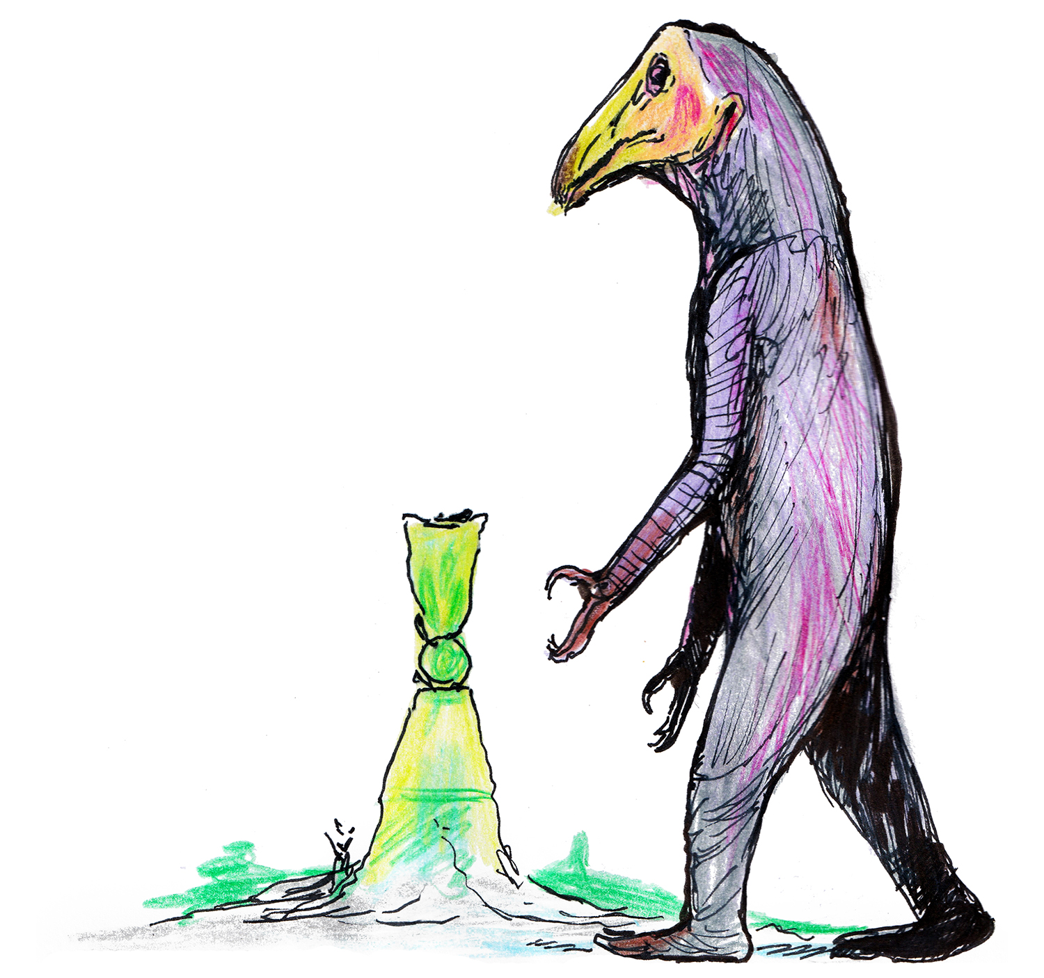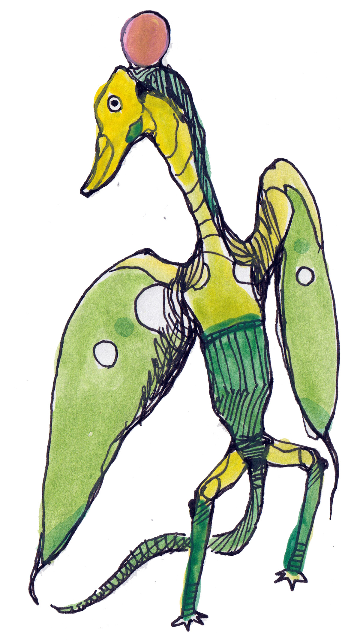 Ballpoint pen doodle of a quasi-avian creature.