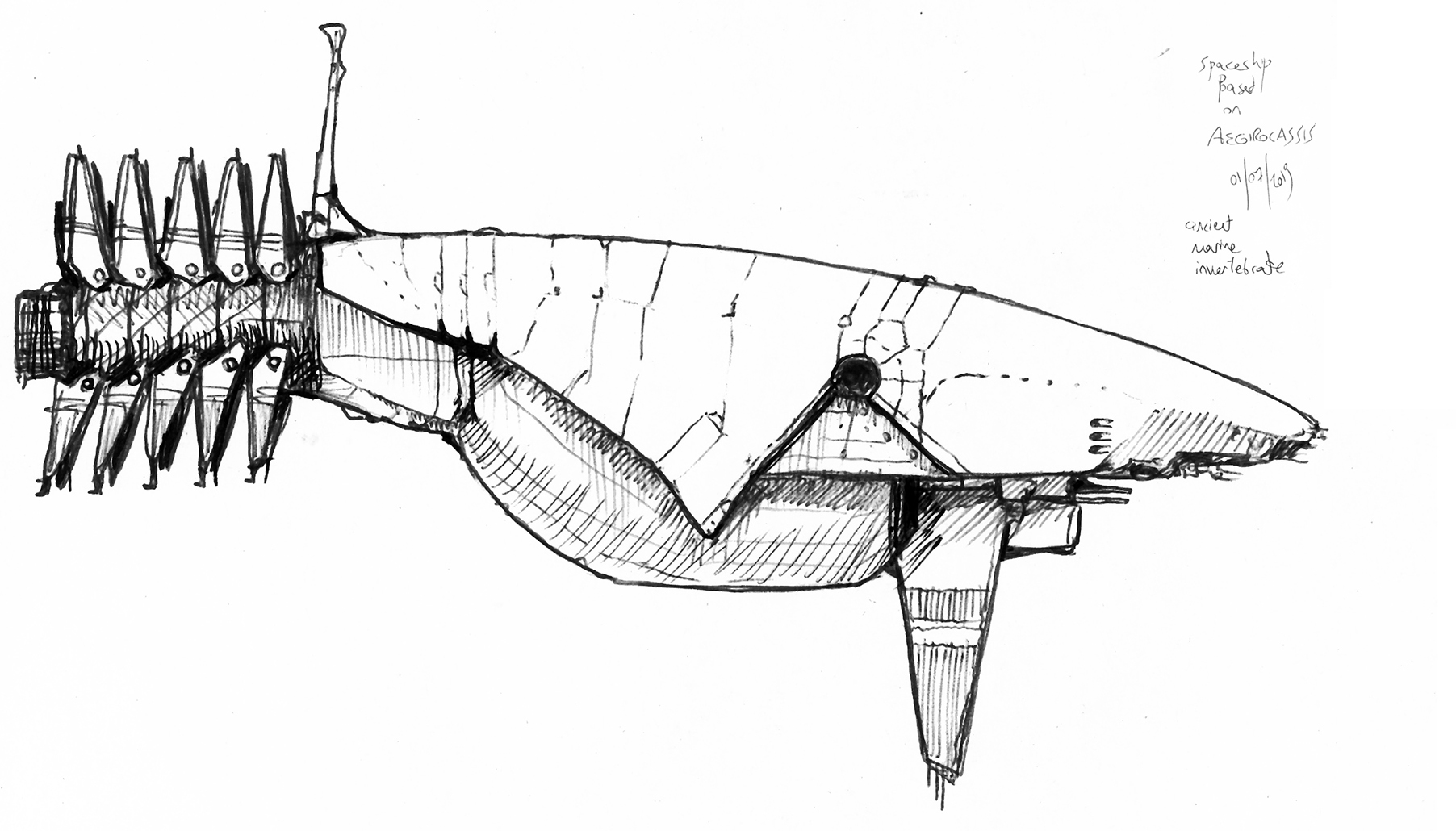 Sketch of a Star Wars spaceship derived from Aegirocassis, a prehistoric marine invertebrate.