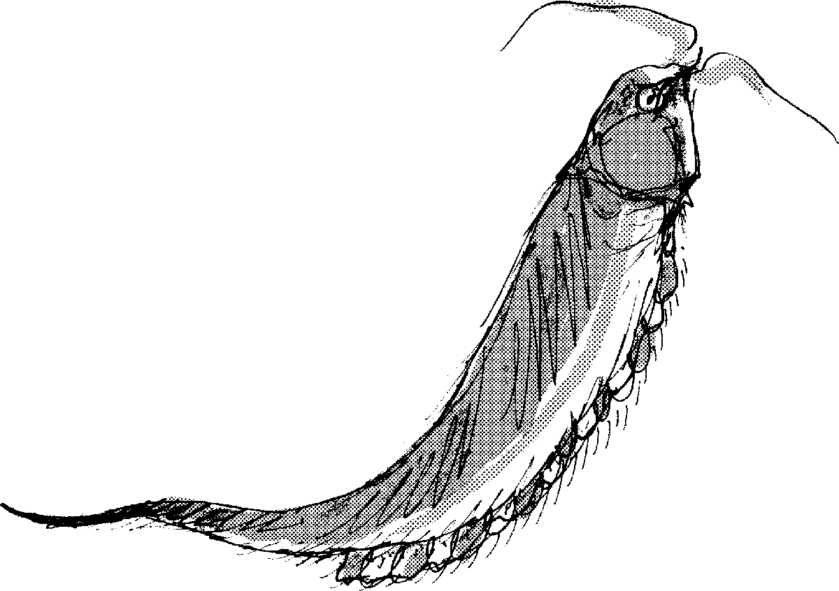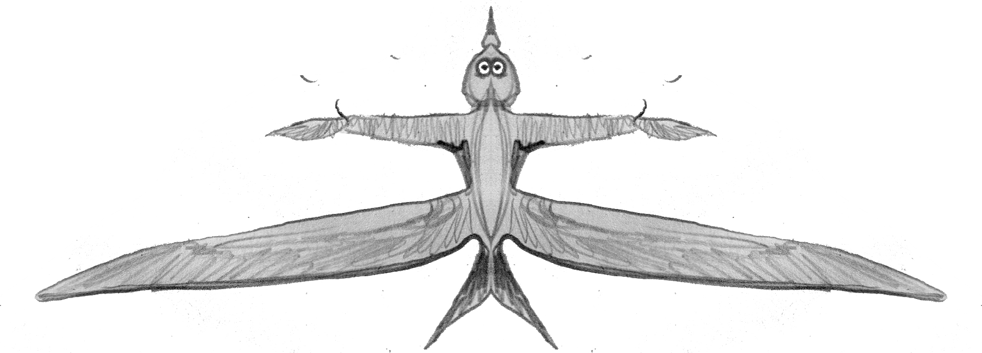 Sketch of a permanently airborne alien creature, adapted to feed on swarms of tiny, gnat-like organisms. The result of an exercise in speculative evolution.