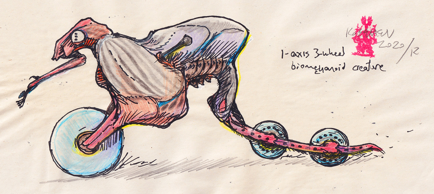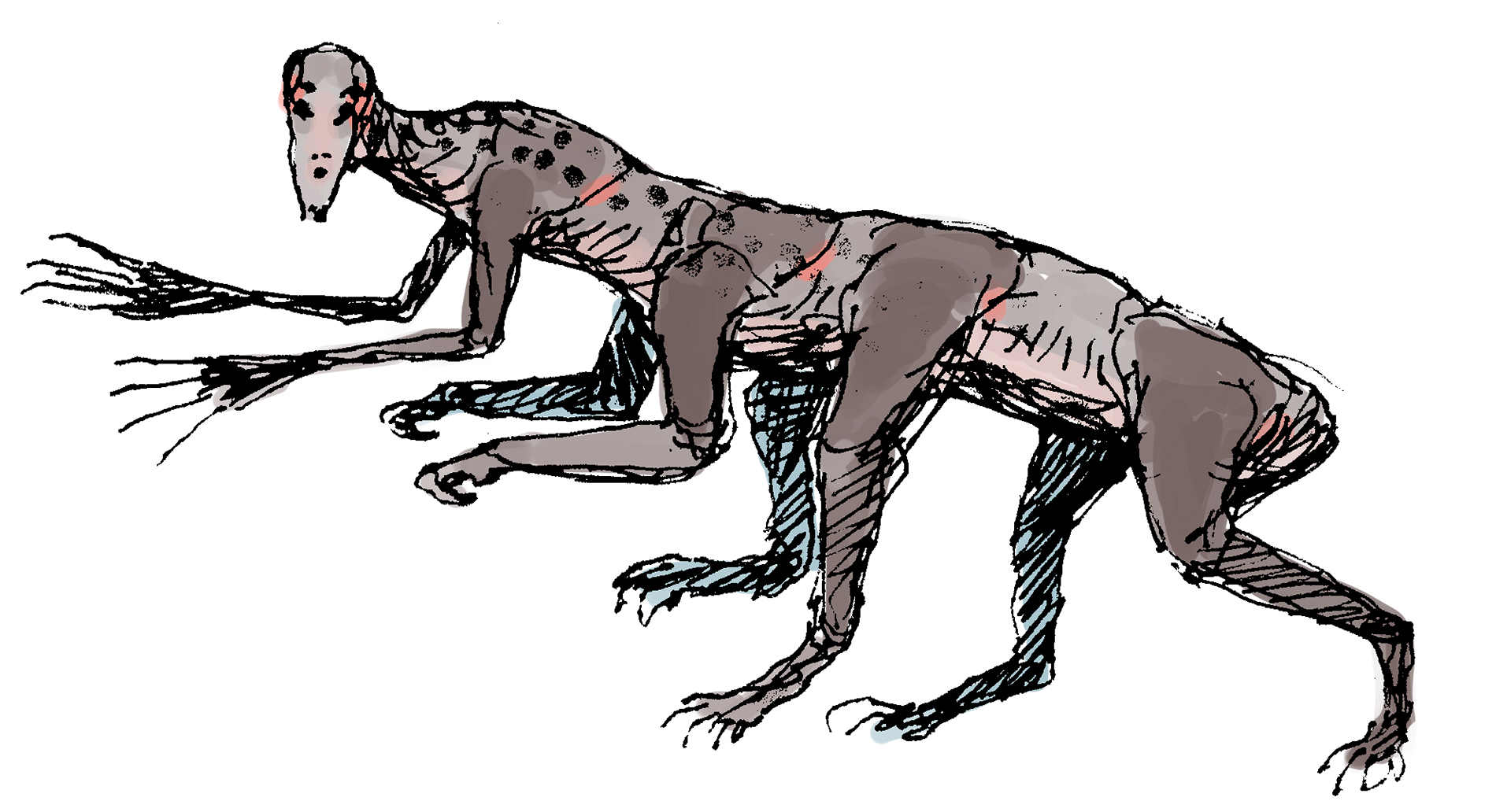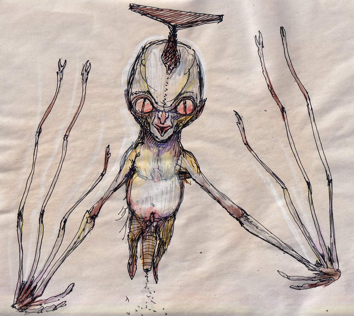 Sketch of an alien creature with stilt-like legs.