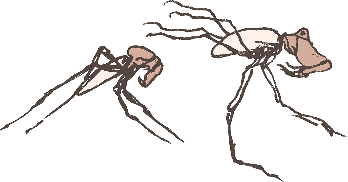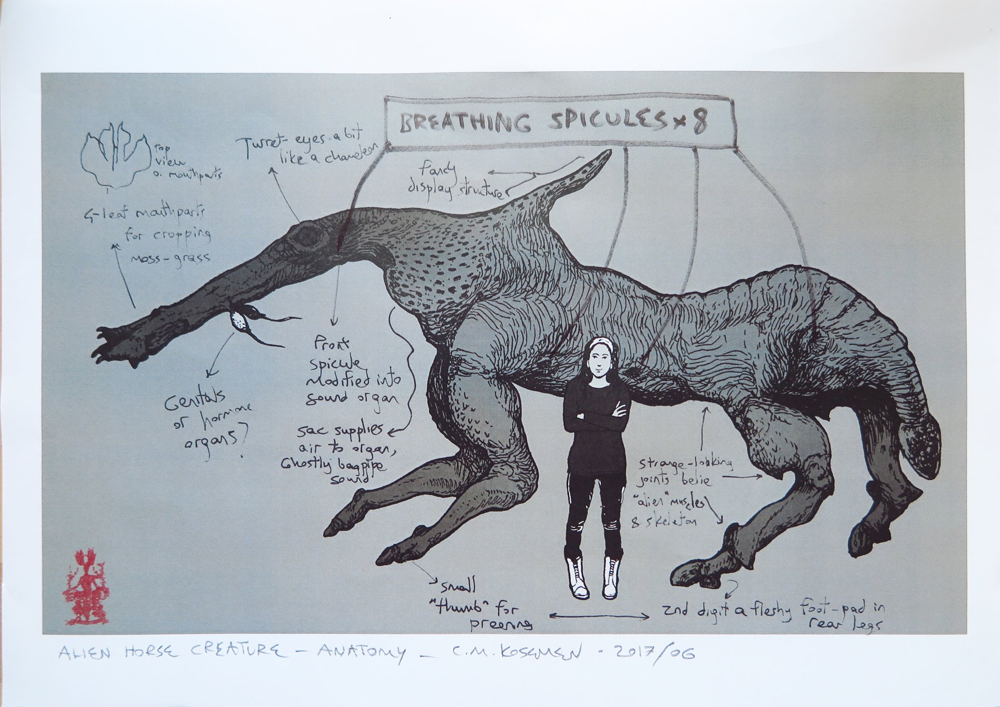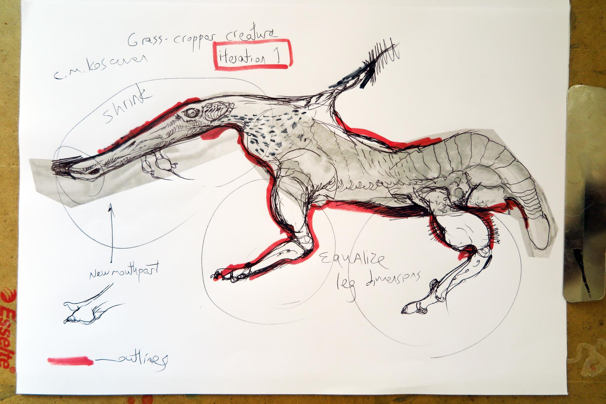 Sketch of an alien creature with stilt-like legs.