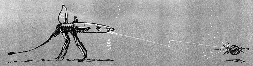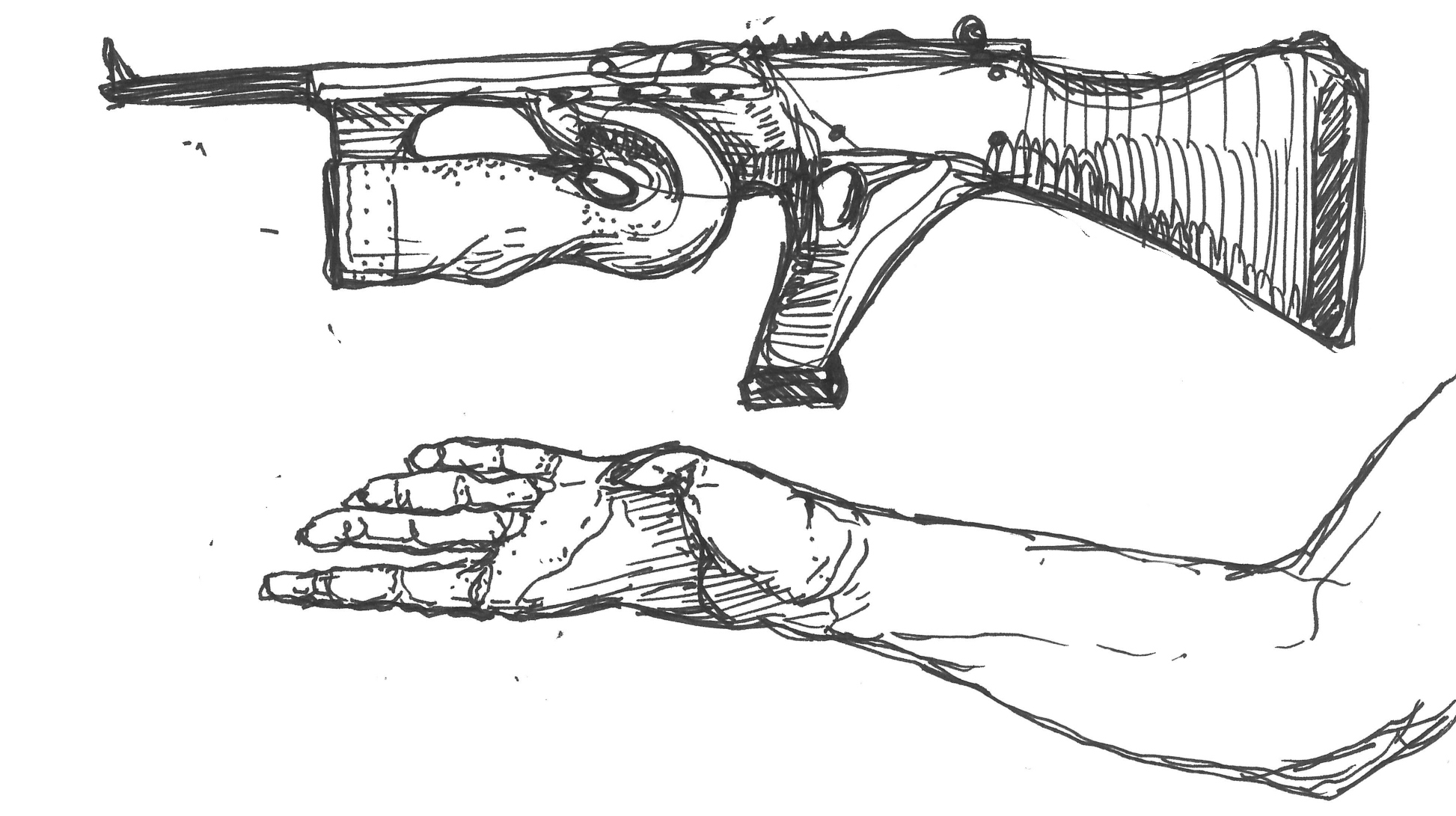 I first doodled this random alien submachine gun (above), then tried to imagine the hand that could grasp it (below).