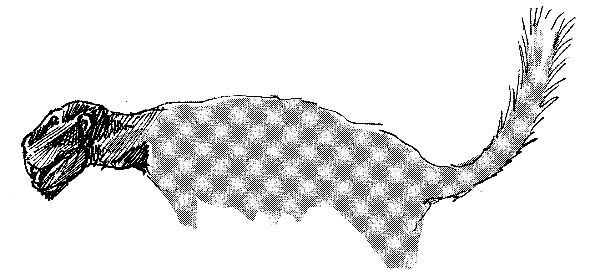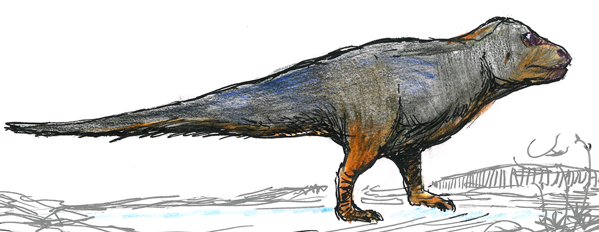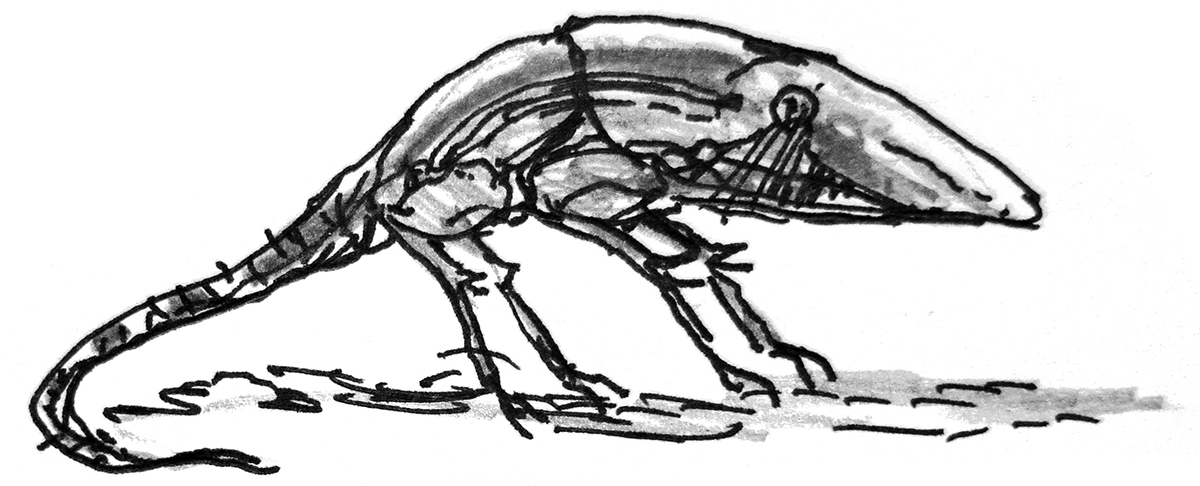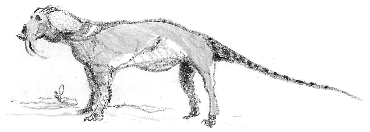 Sketch of Regressitherium, a species of mammal that has secondarily reverted to a cold-blooded, lizard-like existence as a result of its isolated evolution on a barren island chain. Not a real animal, but the product of an exercise in speculative evolution.