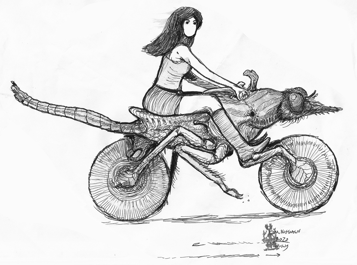 Doodle of a big-brained dinosaur, an exercise in speculative evolution.
