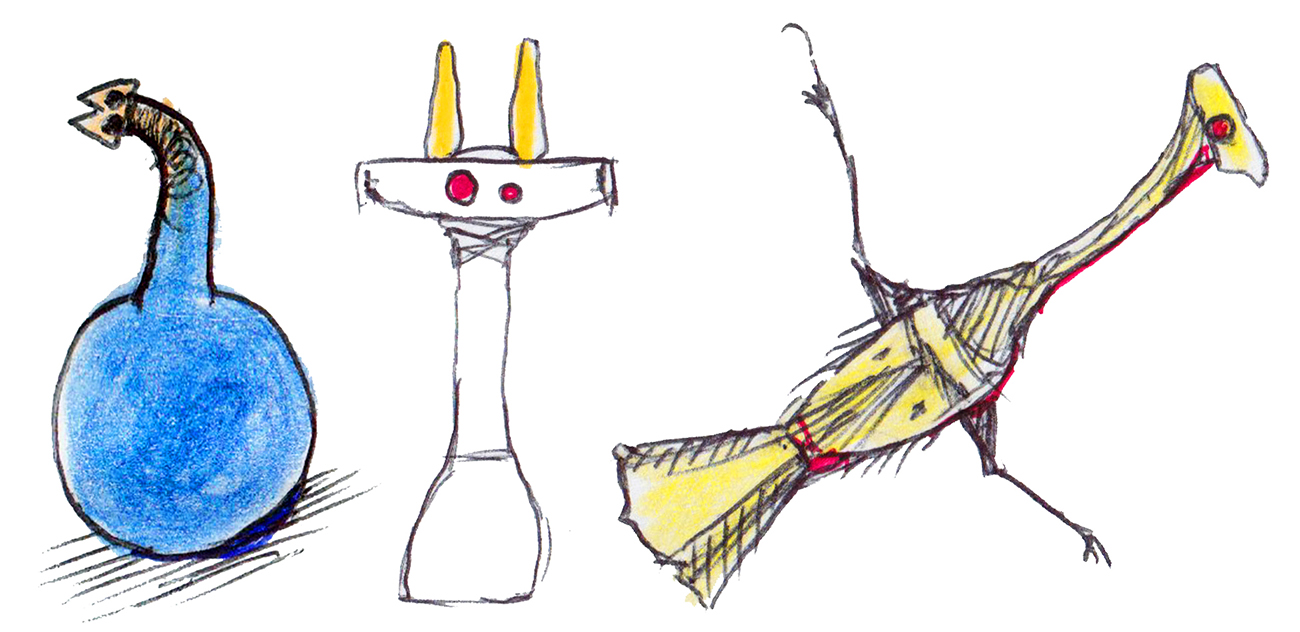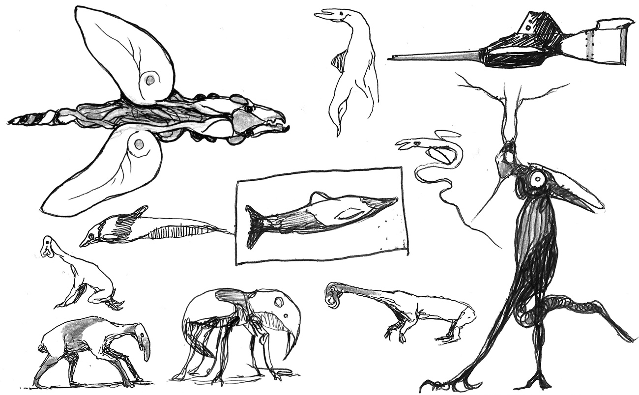 Sketches of weird, bird-like animals. Not real animals, but the results of an exercise in speculative evolution.