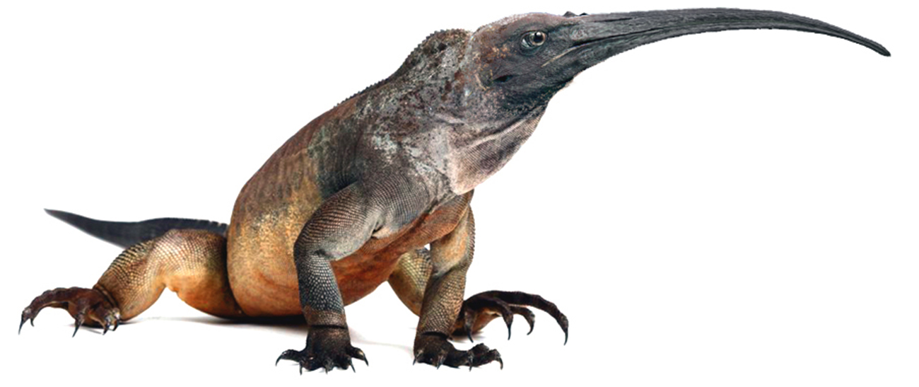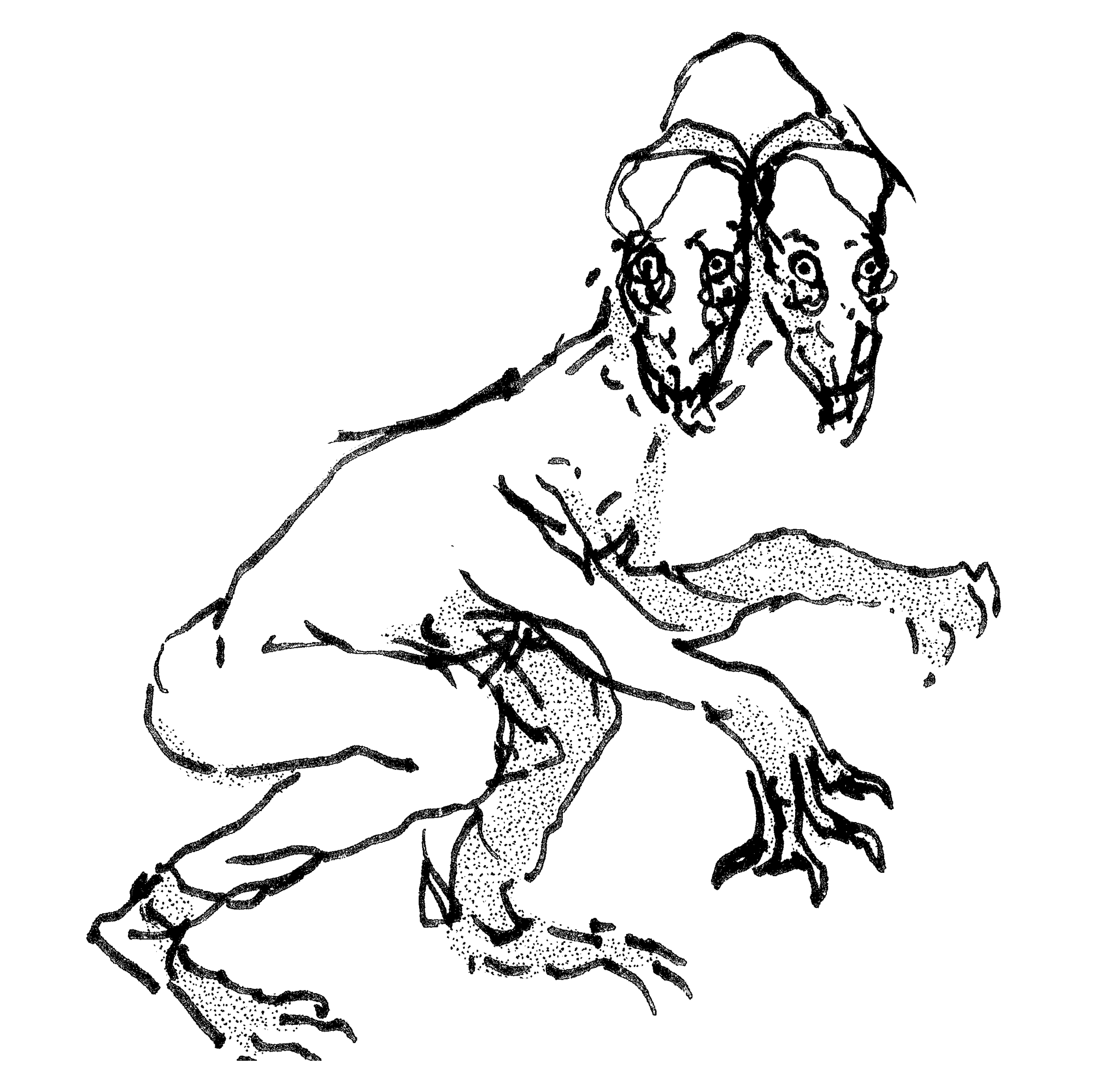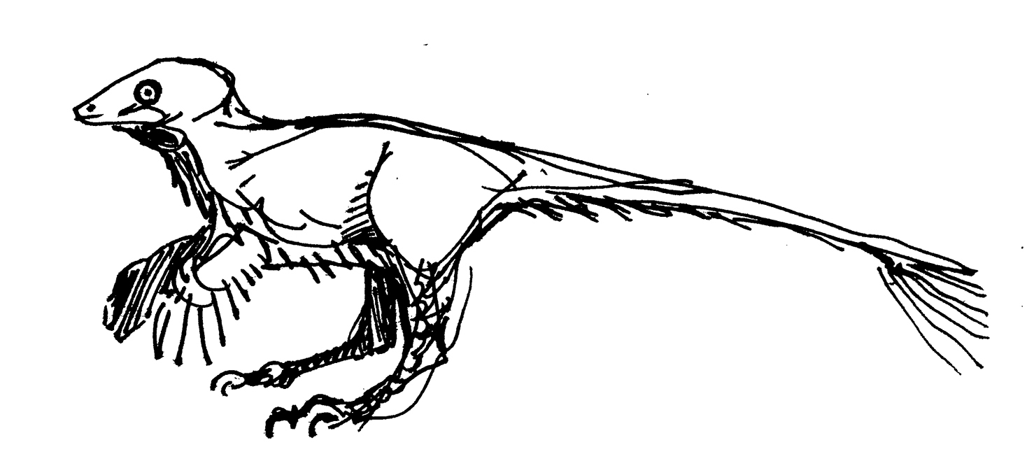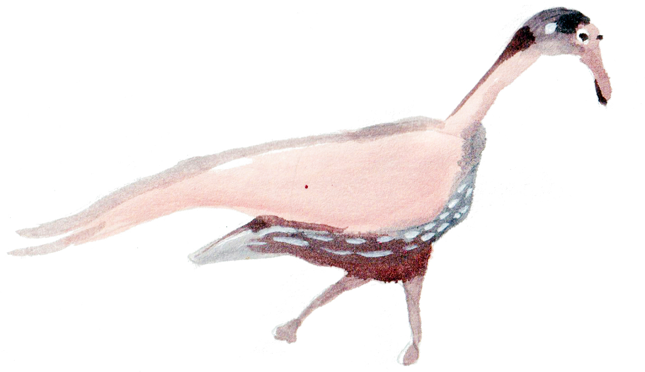 Sketch of a beaked, lizard-like creature running at high speed.