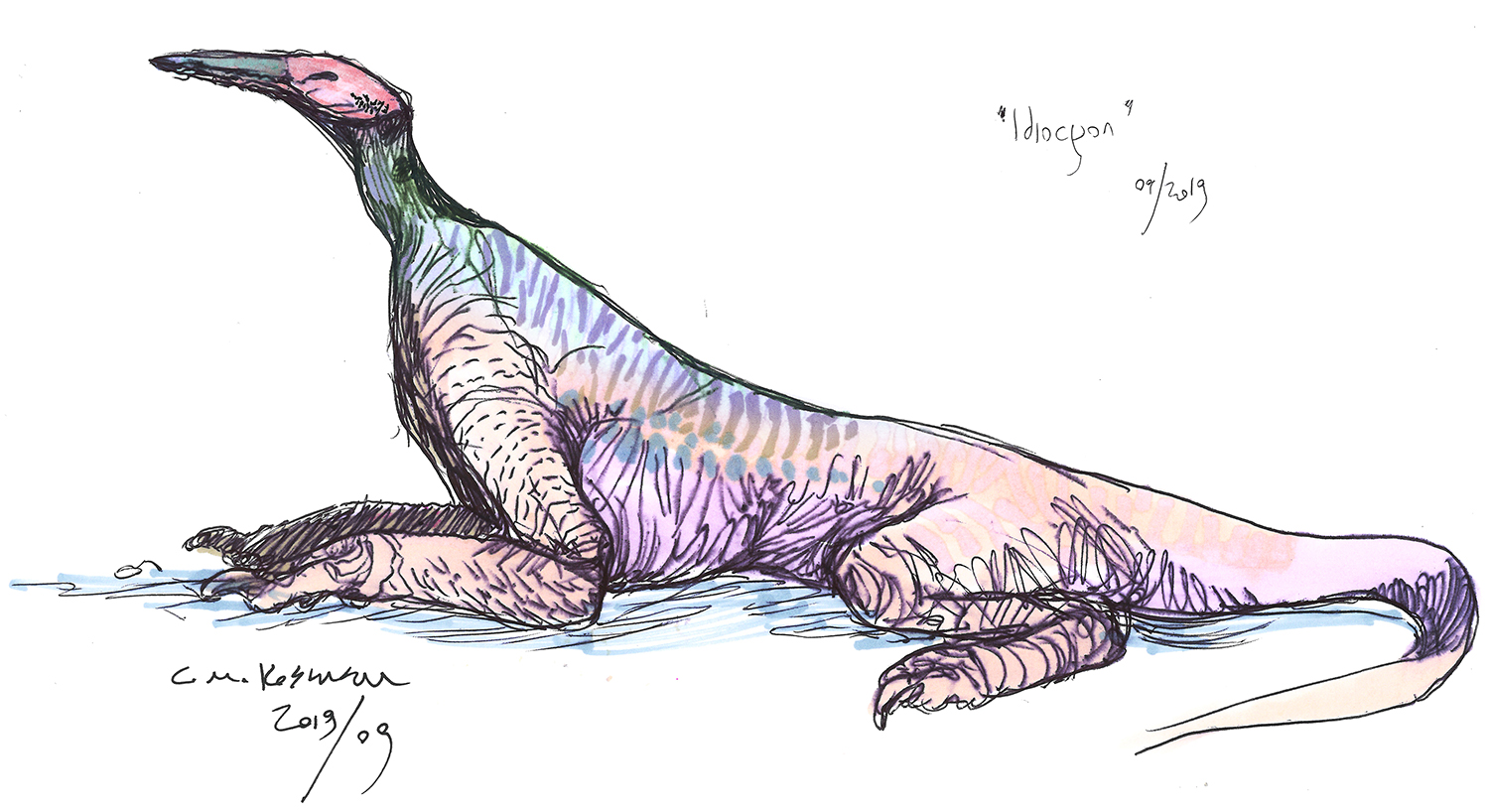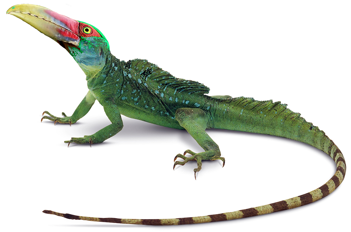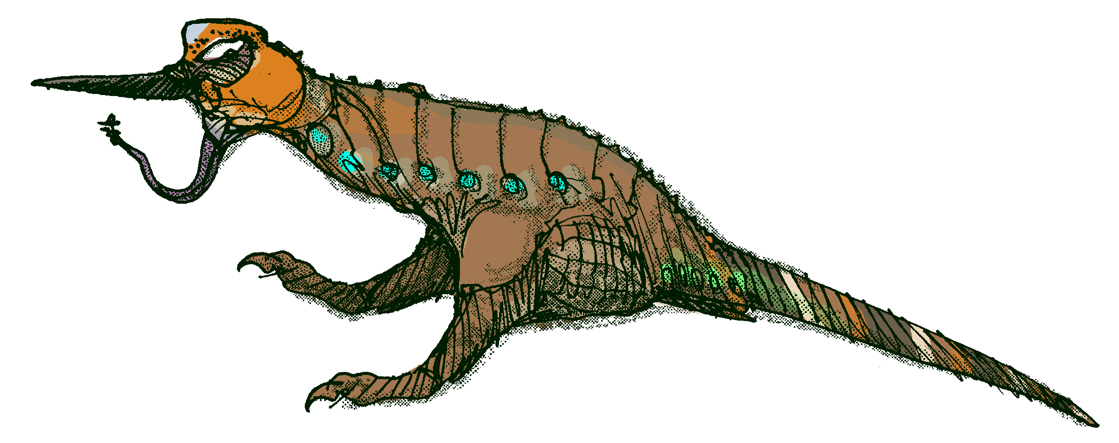 Sketch of a beaked, lizard-like creature running at high speed.