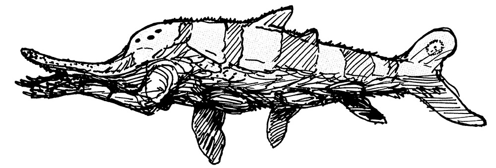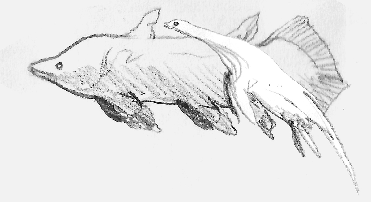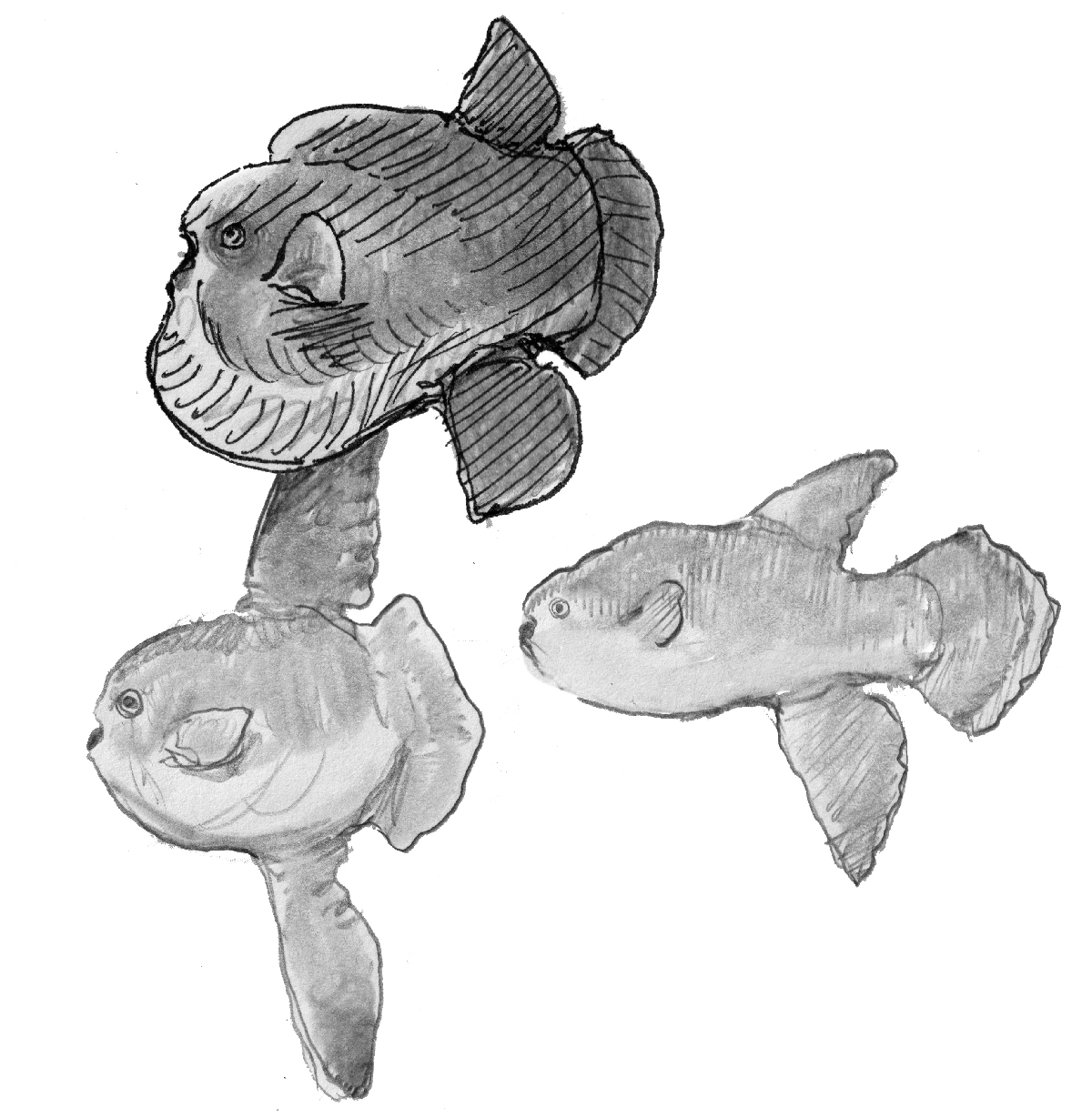 Sketches of weird Moliform fish. Not real animals, but the results of an exercise in speculative evolution.