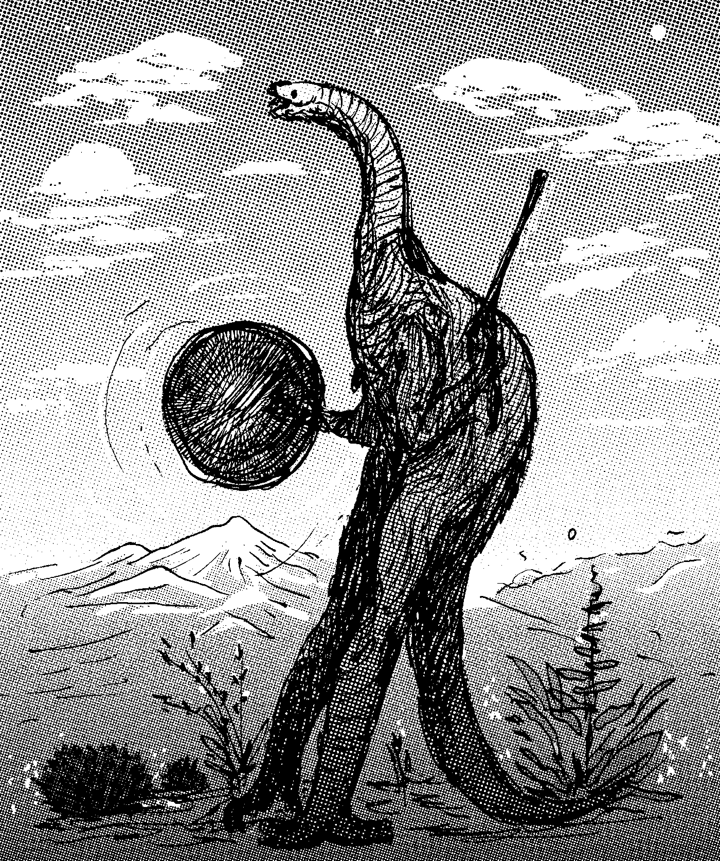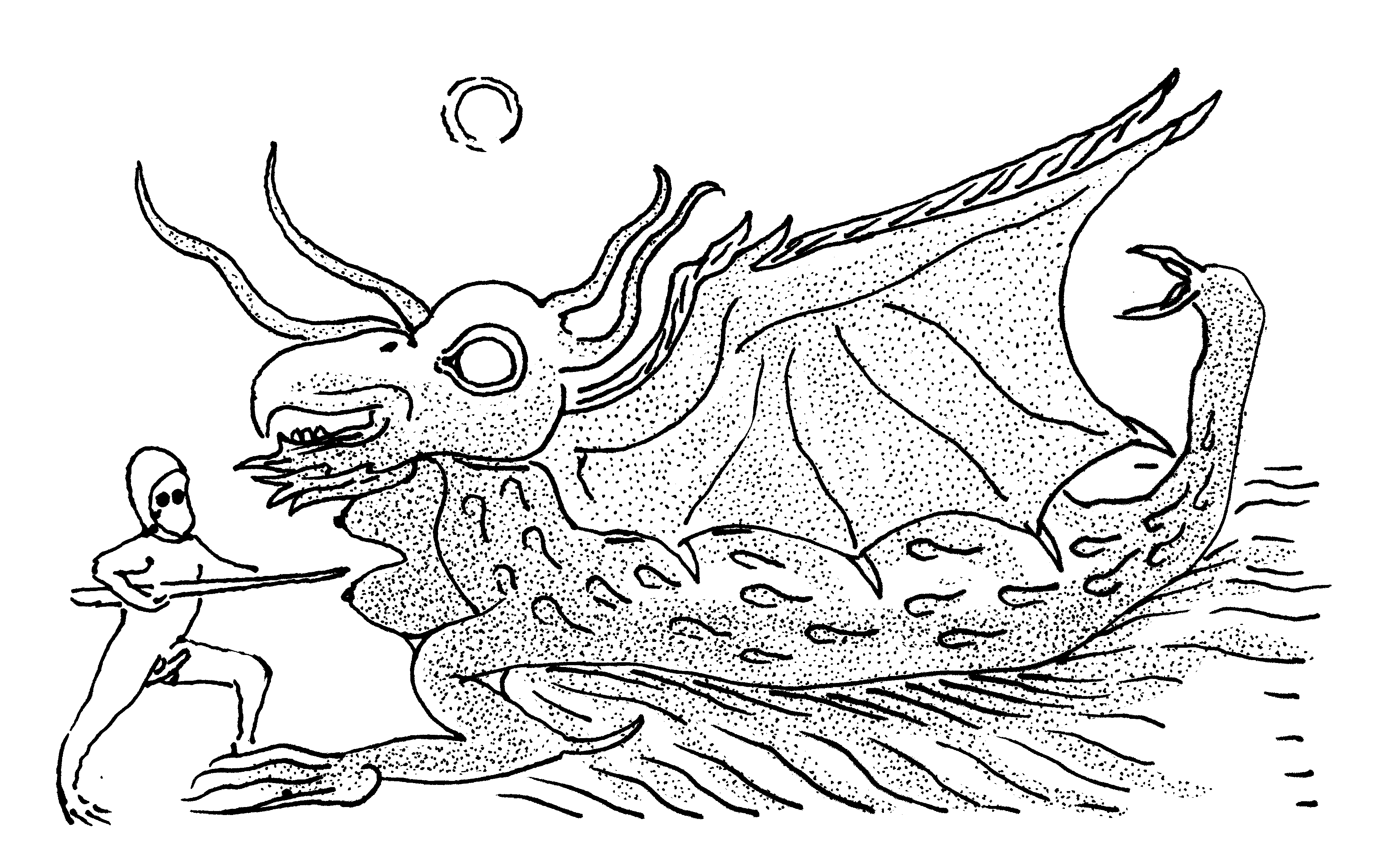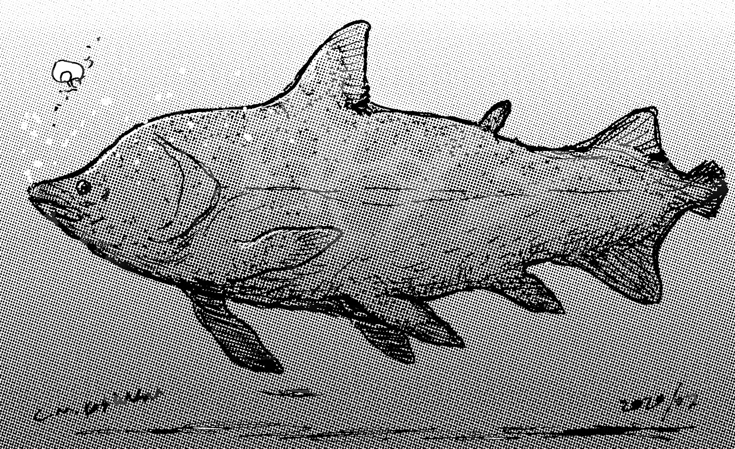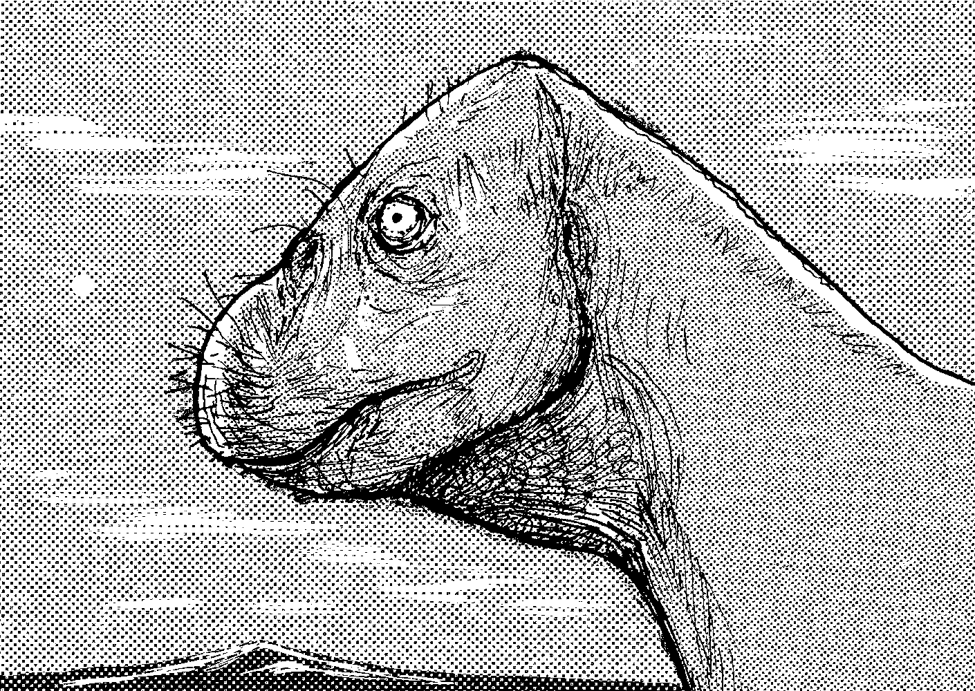 Pointillist sketch of a dog-and-newt-like animal in murky water.