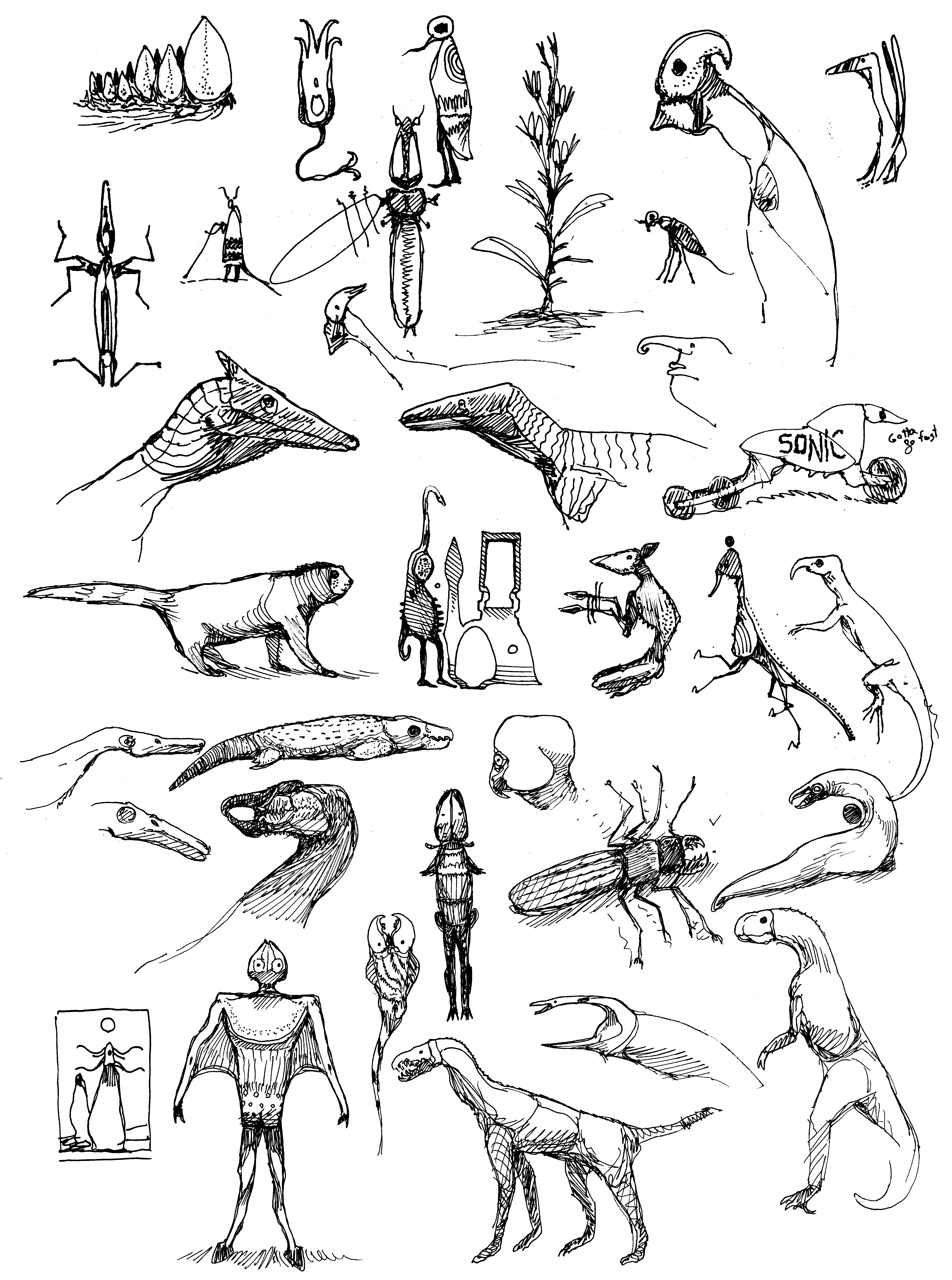 A big page of random creature sketches.