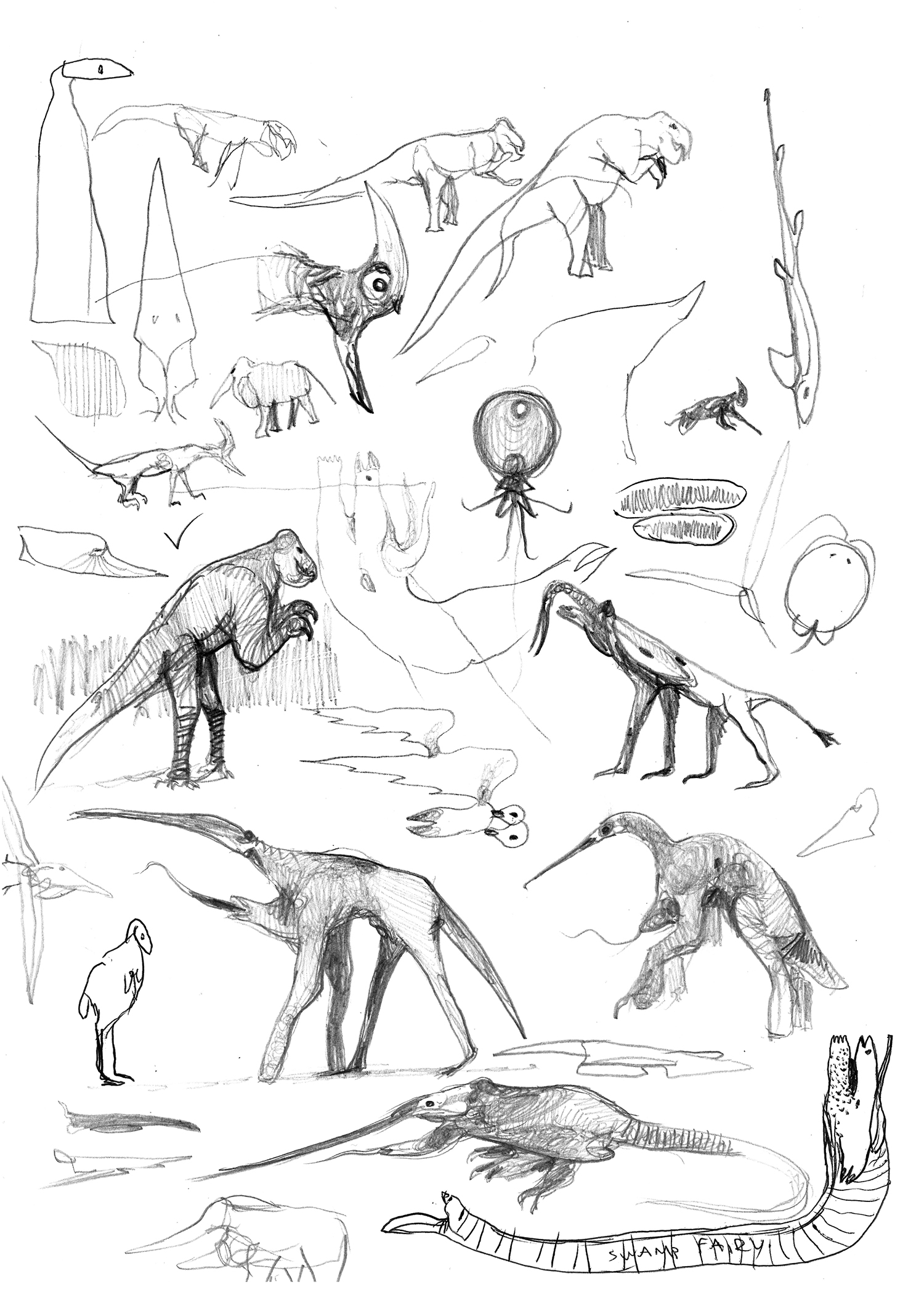 Pencil sketches of various quasi-avian creatures.
