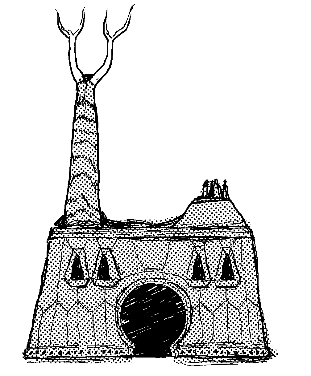 Sketch of a biological "tombstone" that greets visitors and prays for the soul of the person lying beneath it. An artificial organism that subsists on photosynthesis and organic detritus. Evidently, the makers of this living monument can create custom lifeforms to suit their will, but still remain unable to defeat death.