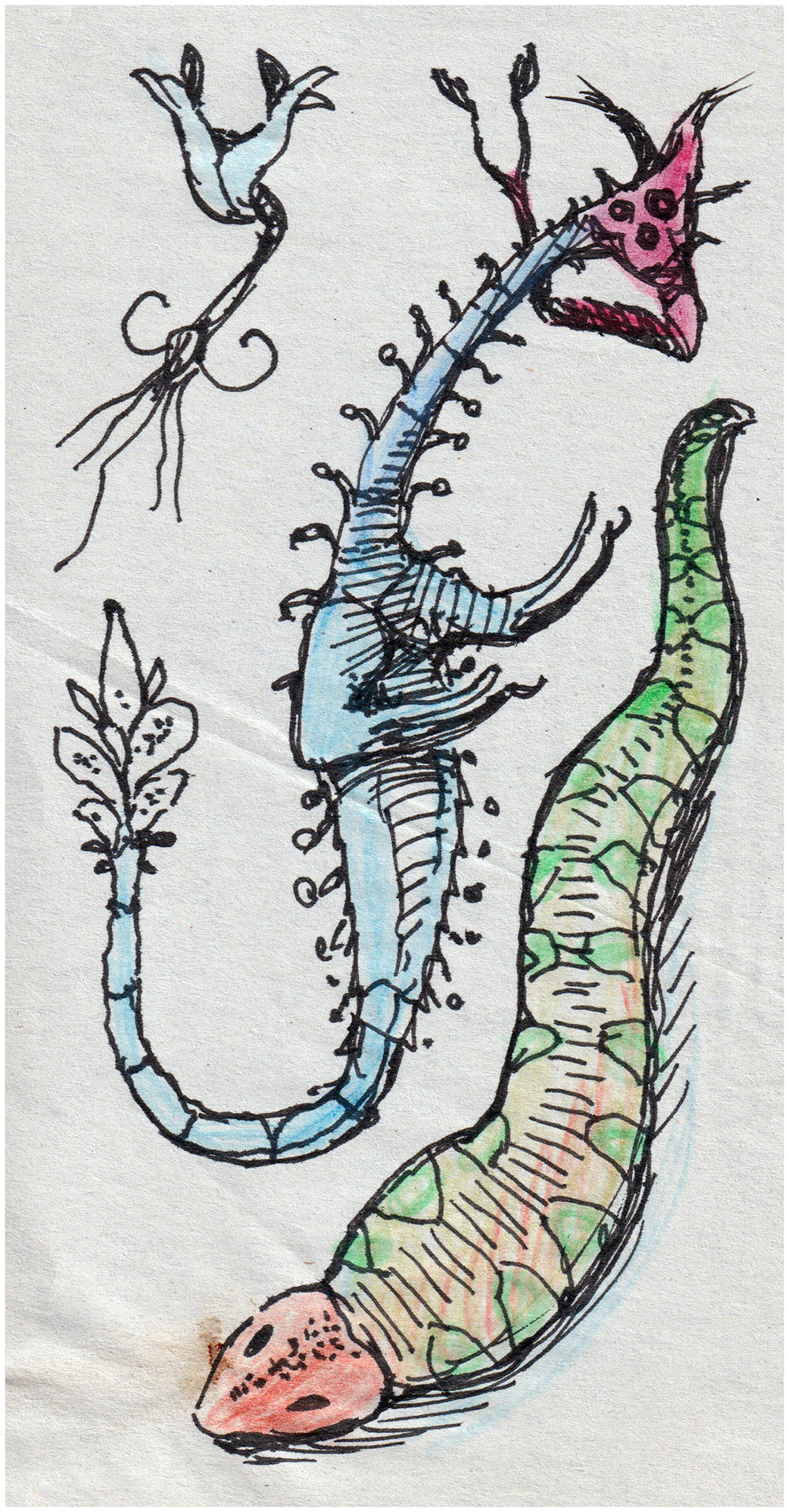 Pen-and-marker sketch of a colourful fantasy creature that resembles a dog-reptile hybrid.