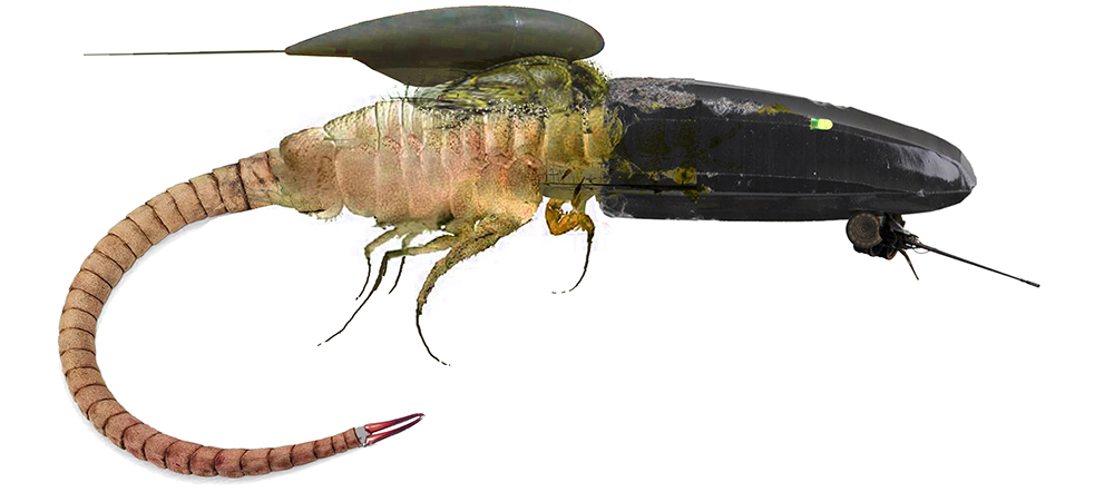 The famous paradoxical Cambrian organism Opabinia re-designed as a vertebrate-like animal, after a concept by Julio Nicoletti.