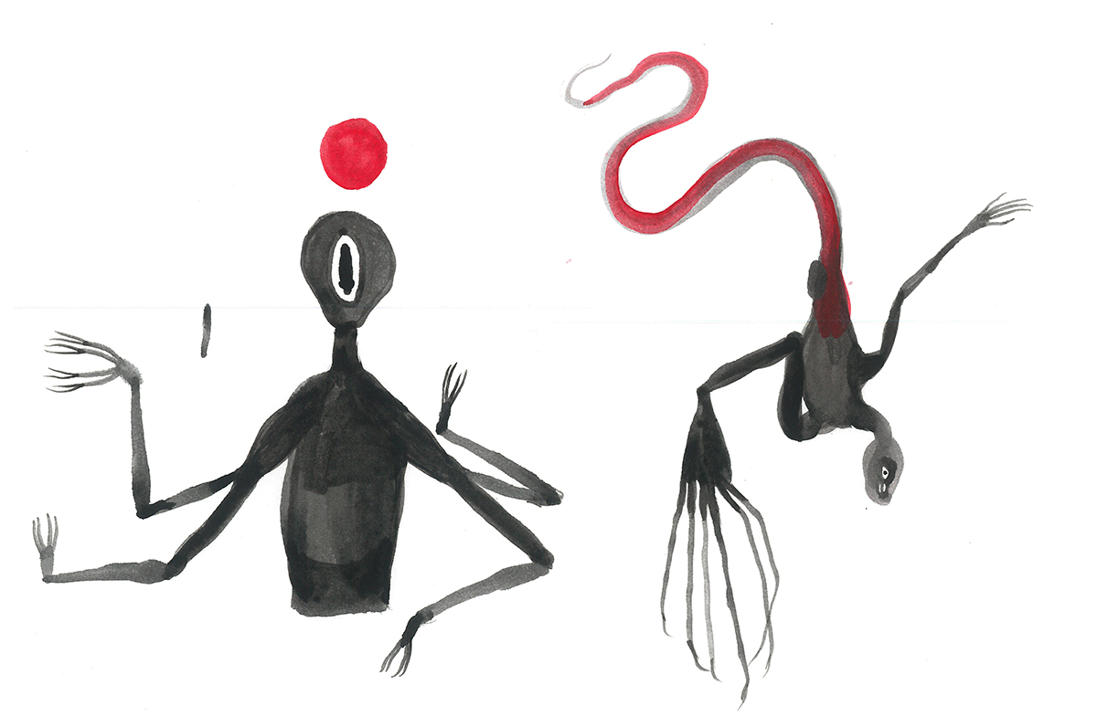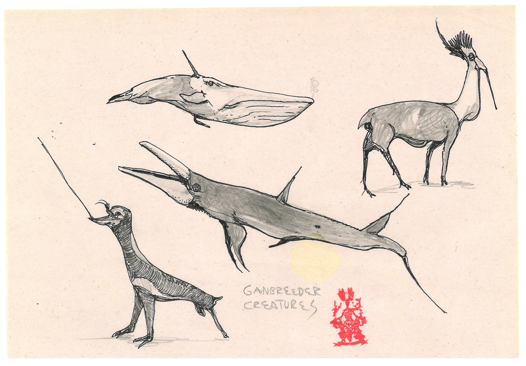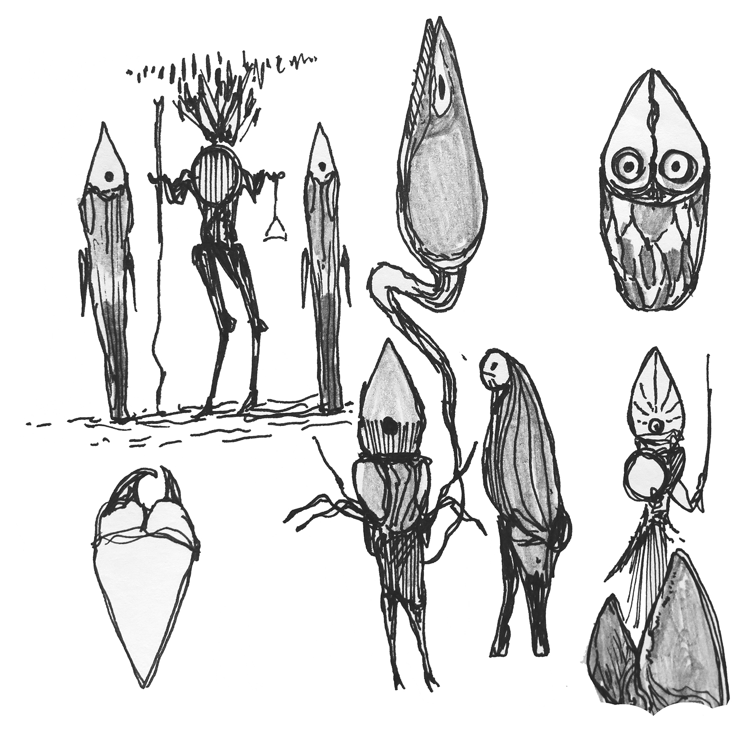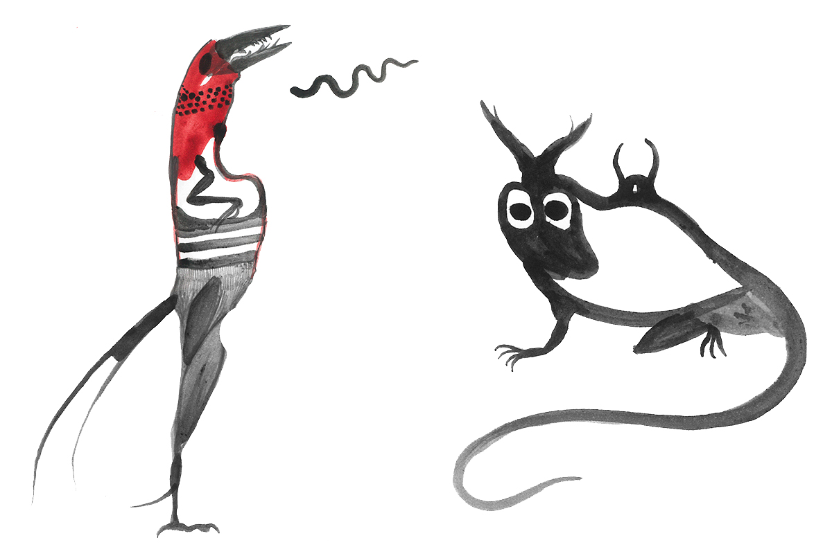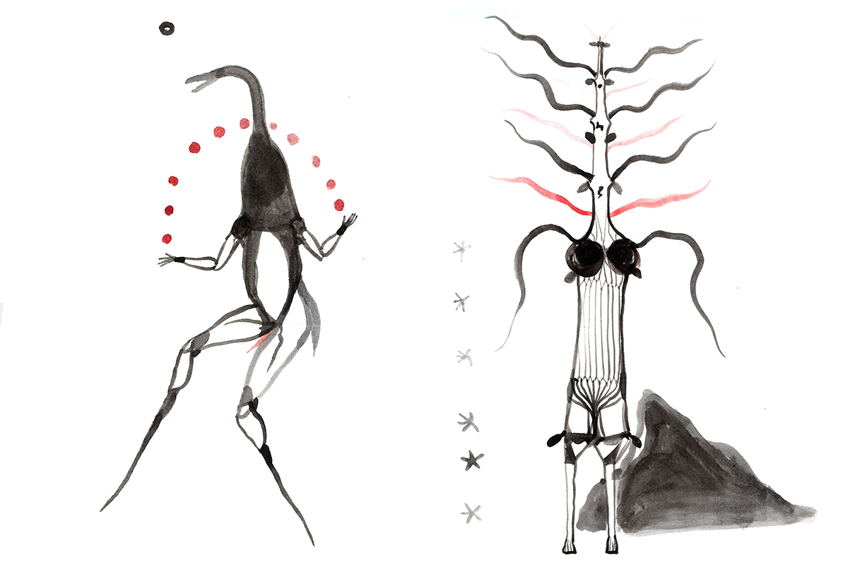 Loose sketches of symbolic creatures.