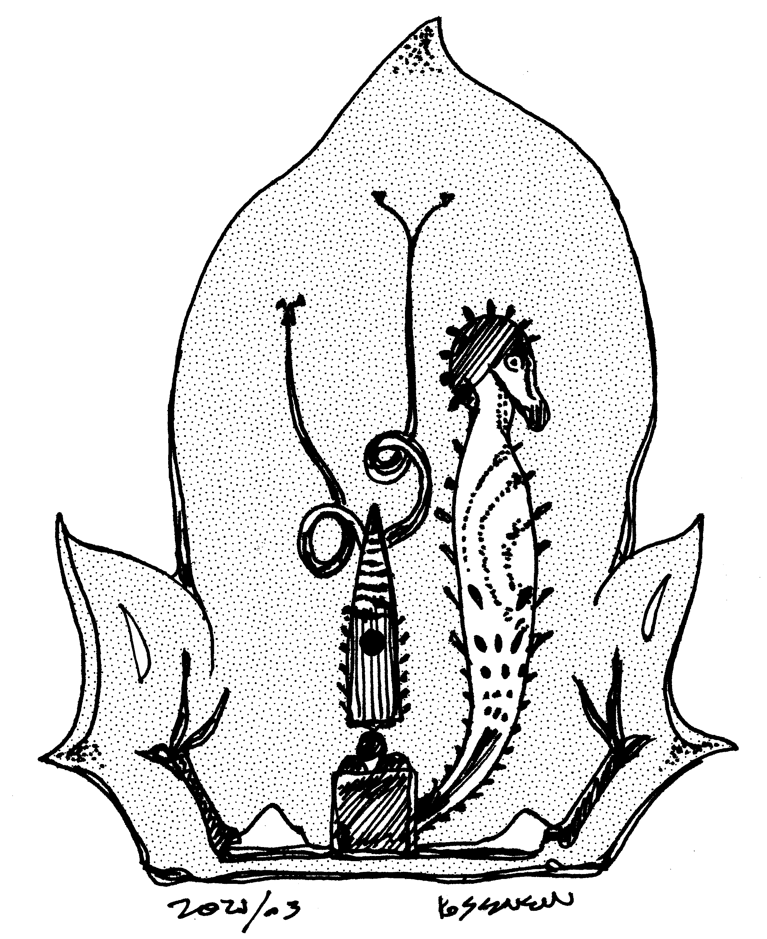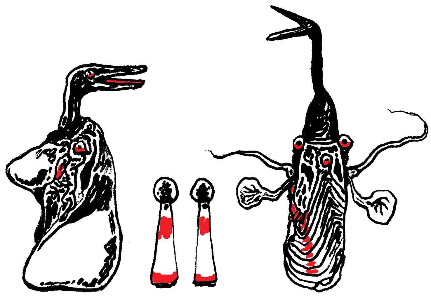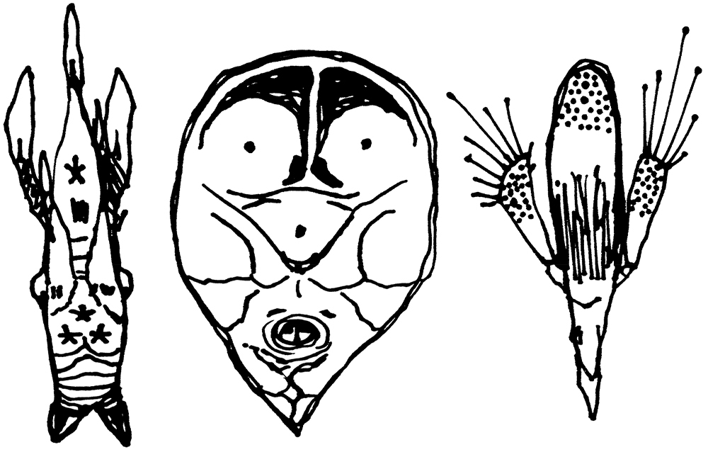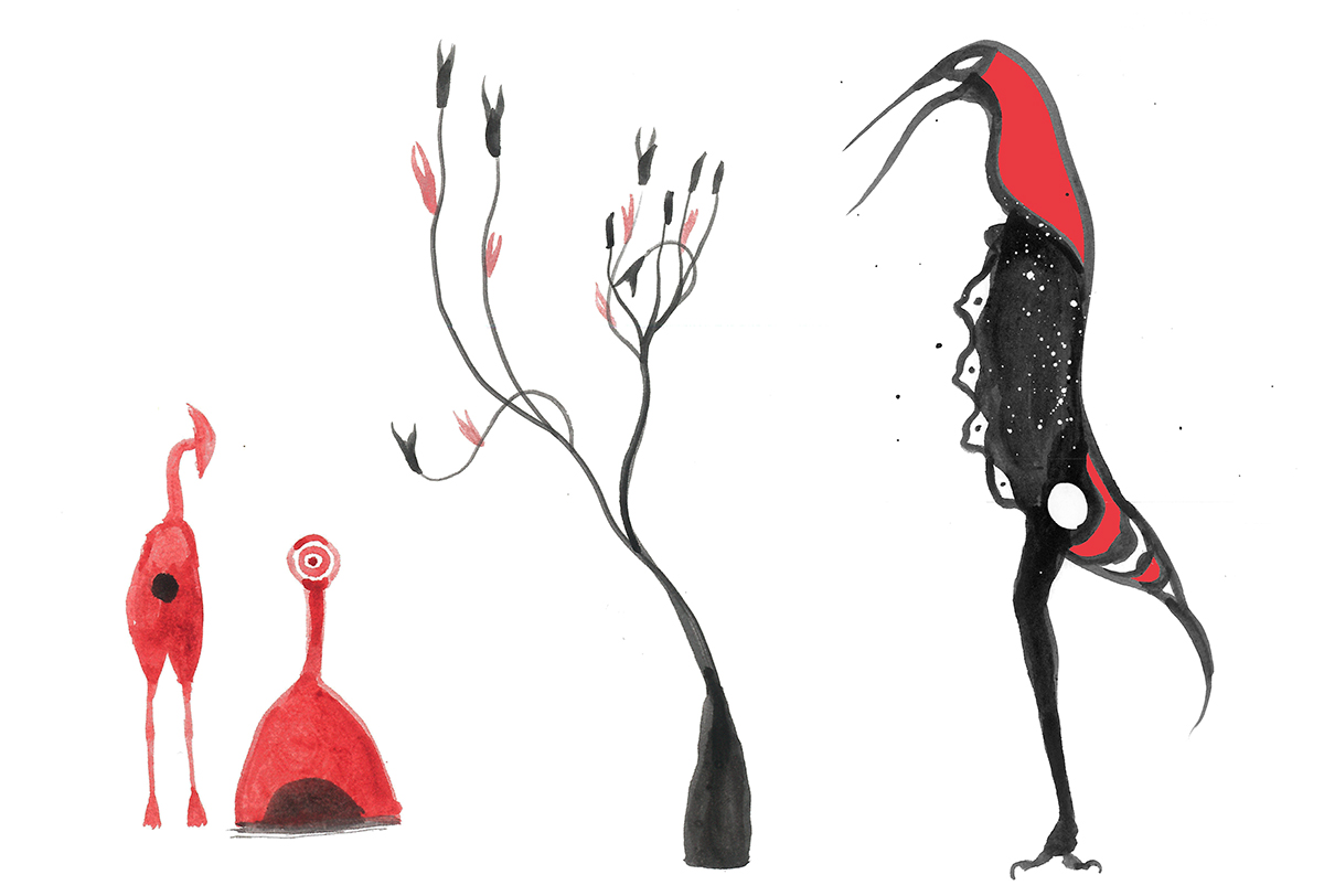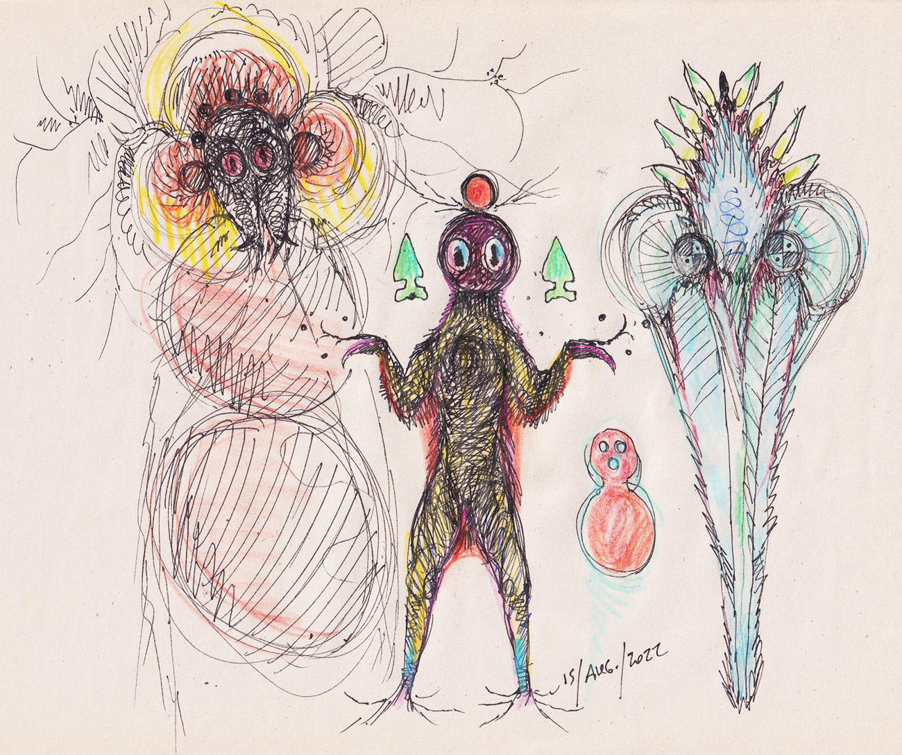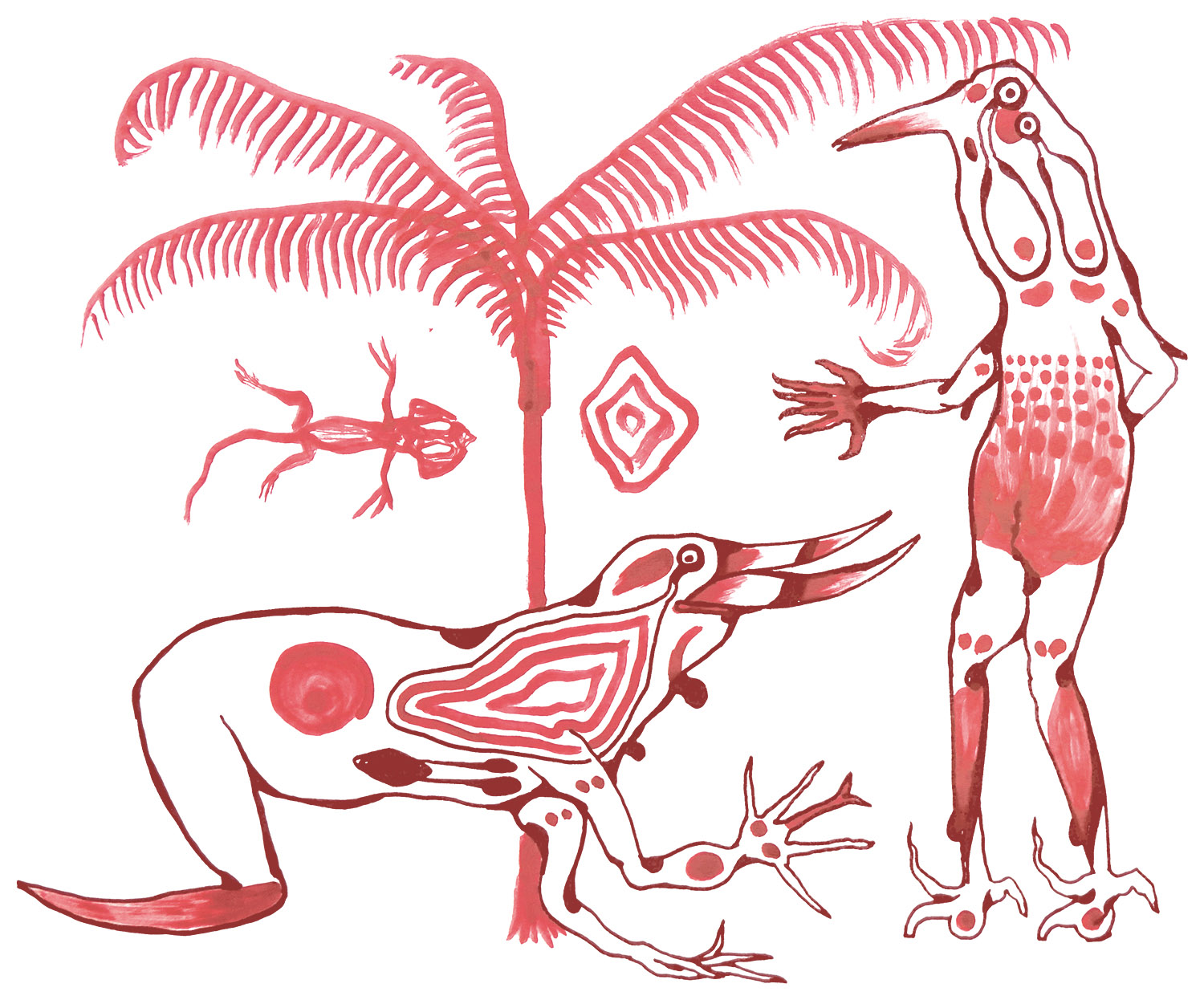 Loose sketches of symbolic creatures.