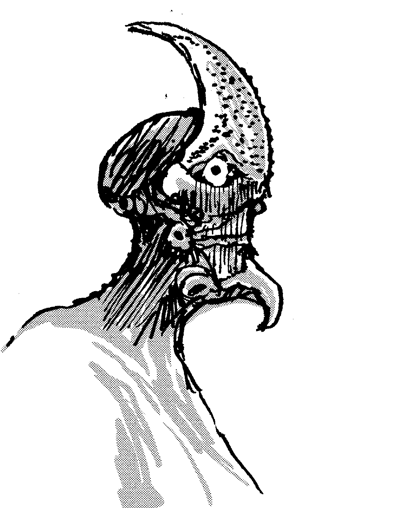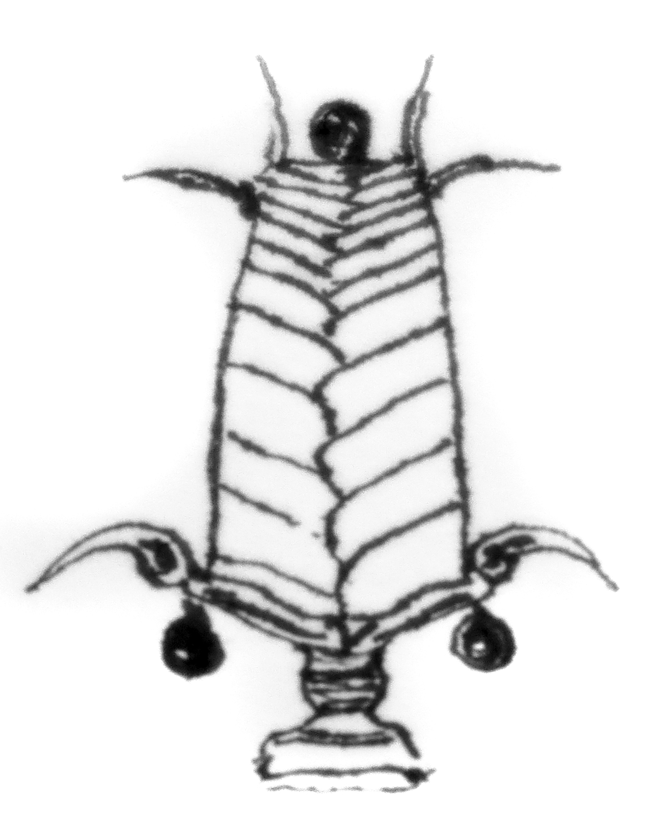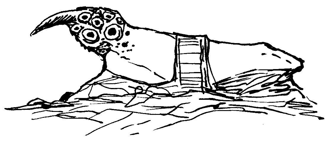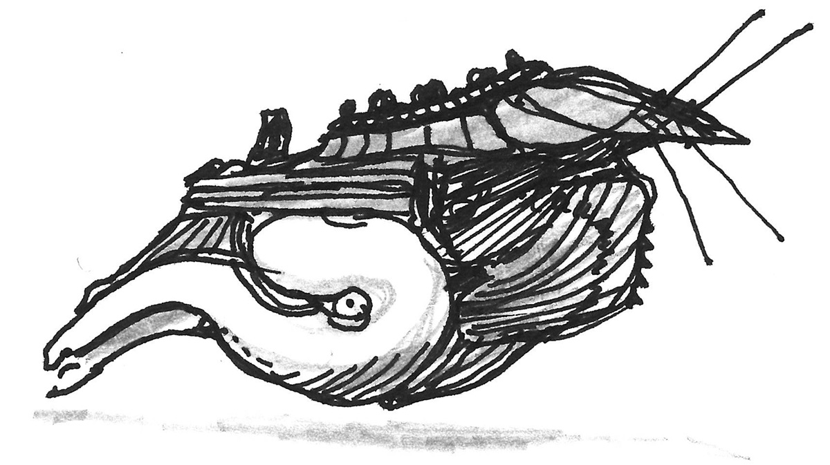 Sketch of a para-vertebral "headbanger creature" that head-butts its victims, an exercise in speculative evolution.