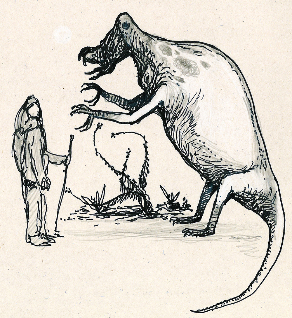 Sketch of a giant, semi-sophont animal trying to communicate with a human explorer. The result of an exercise in speculative evolution.