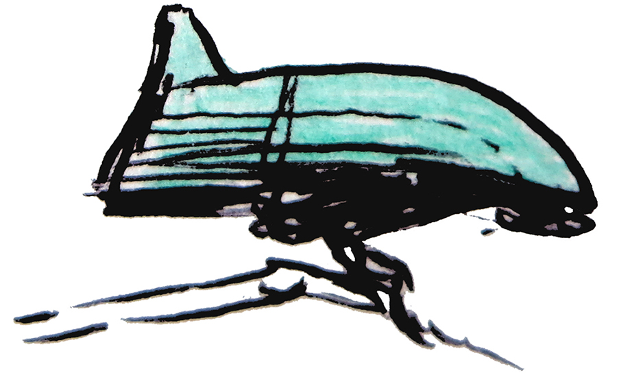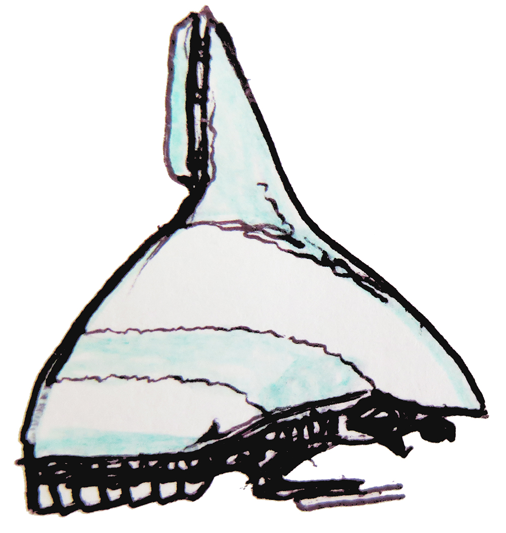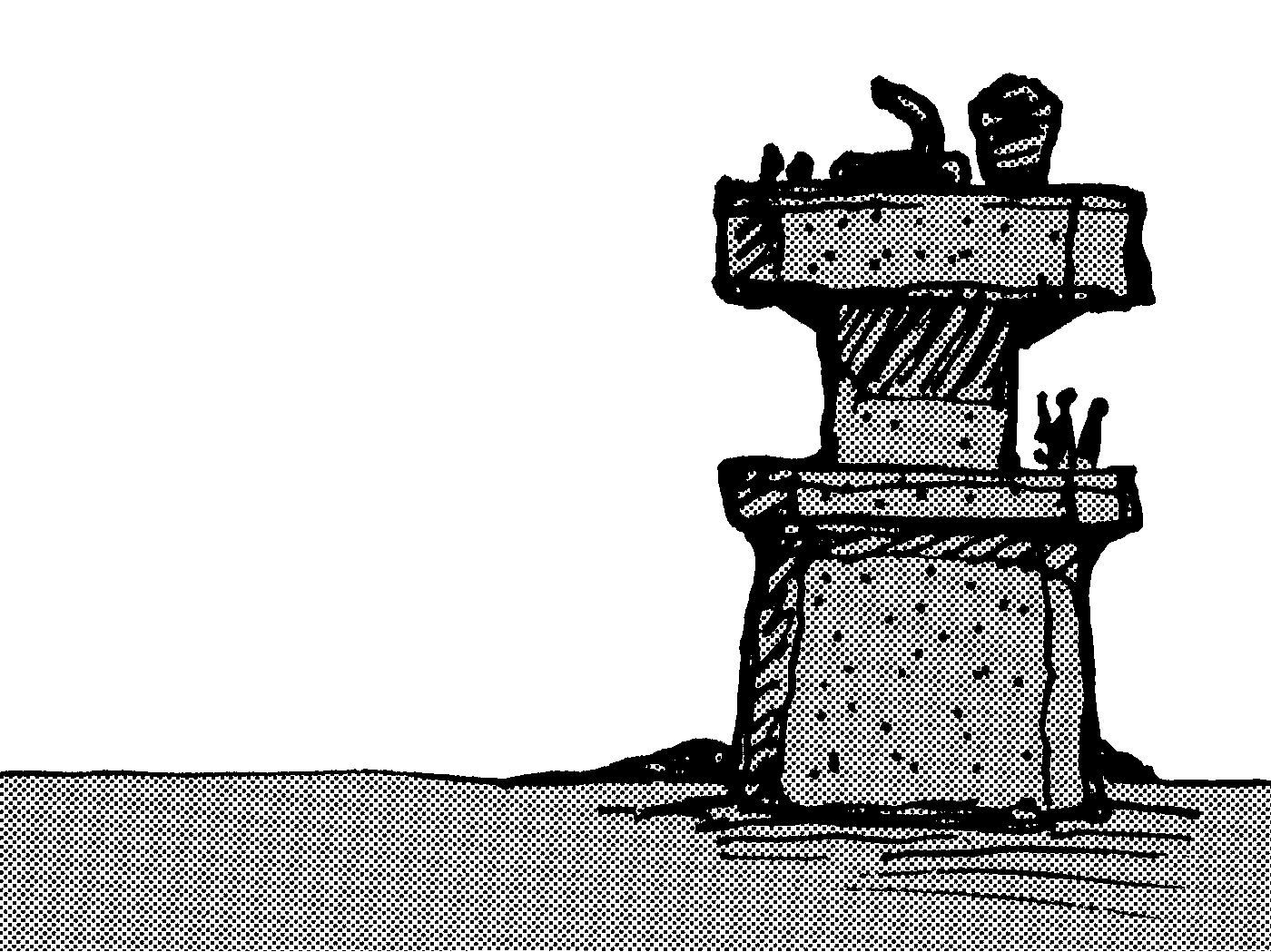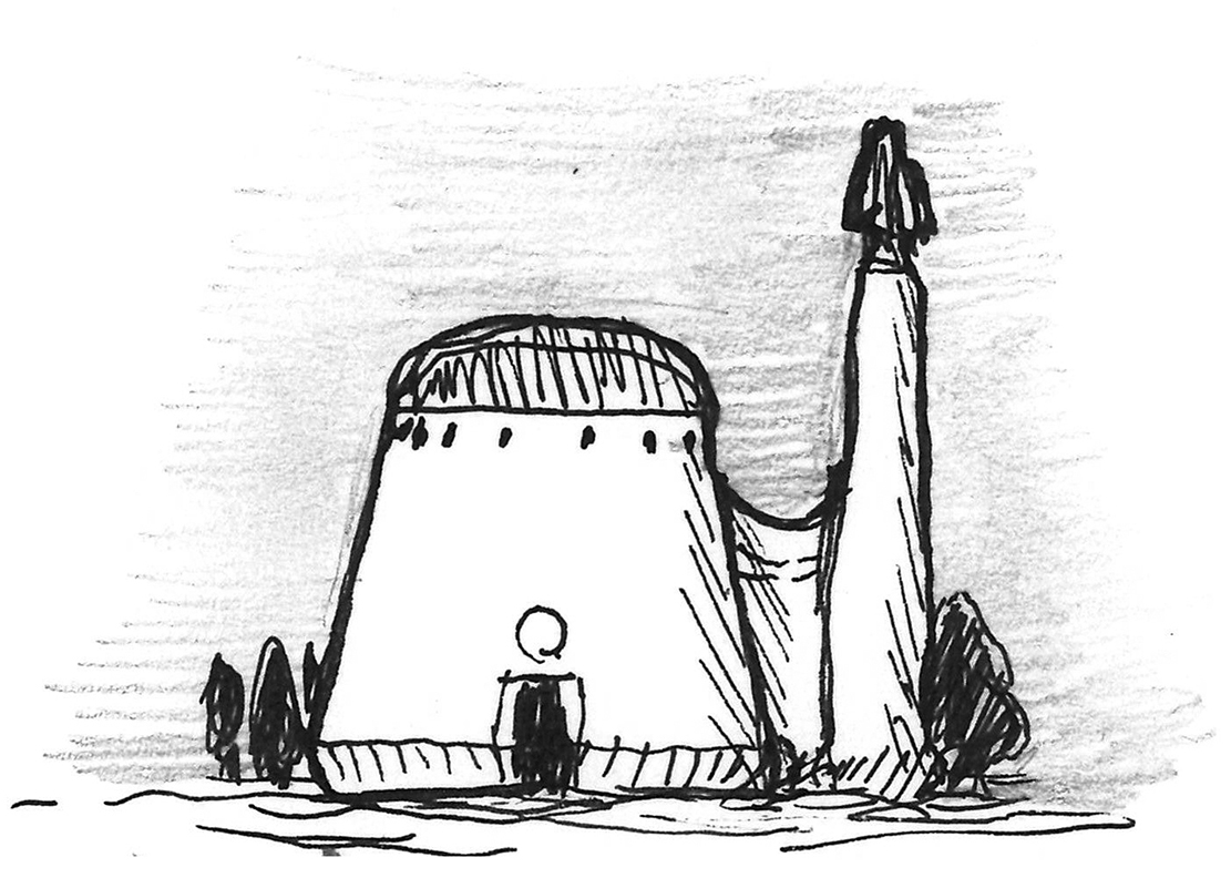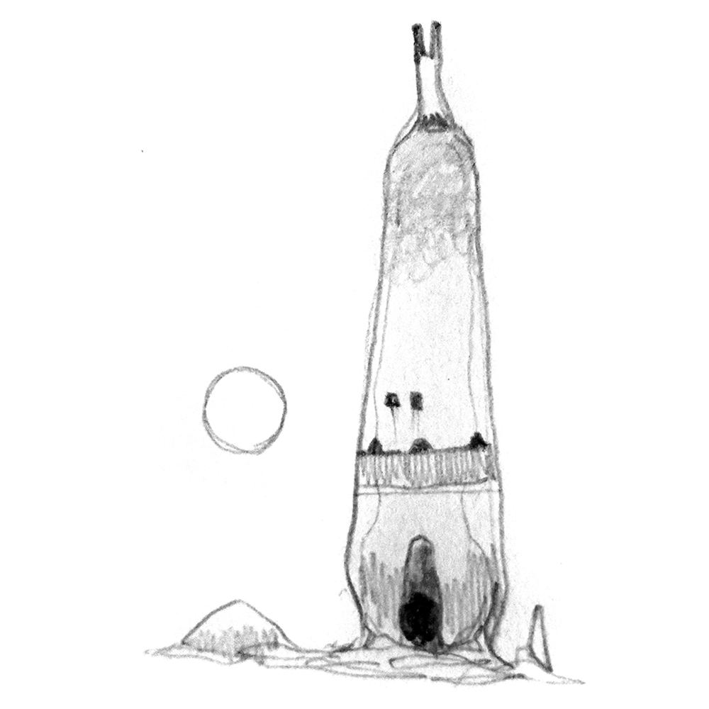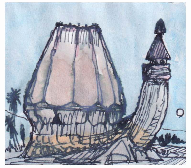 Sketch of a piscoid creature and the tower-bearing cistern it was raised in. Not a real animal, but the result of an exercise in speculative evolution.