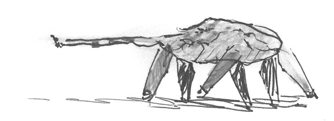 Loose sketches of a sauropod dinosaur (below), and a speculative animal that looks like a sauropod dinosaur (above).