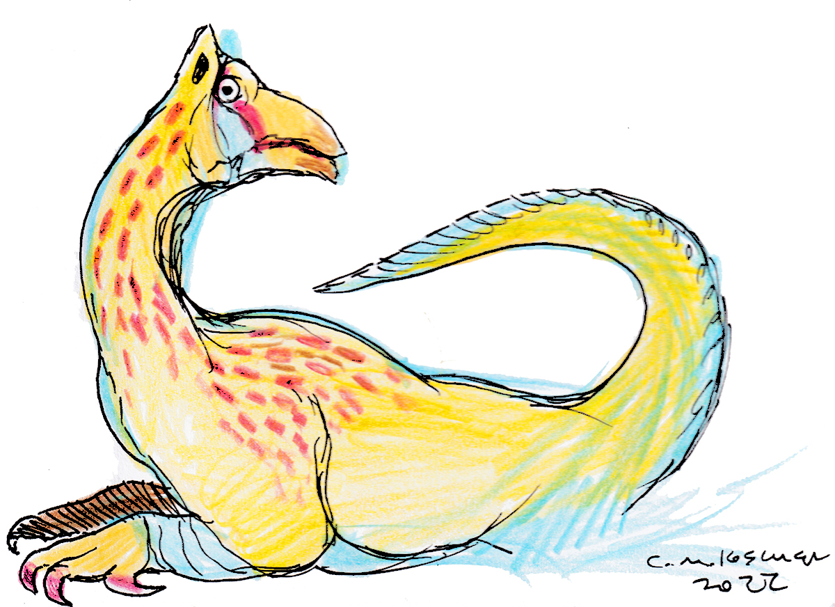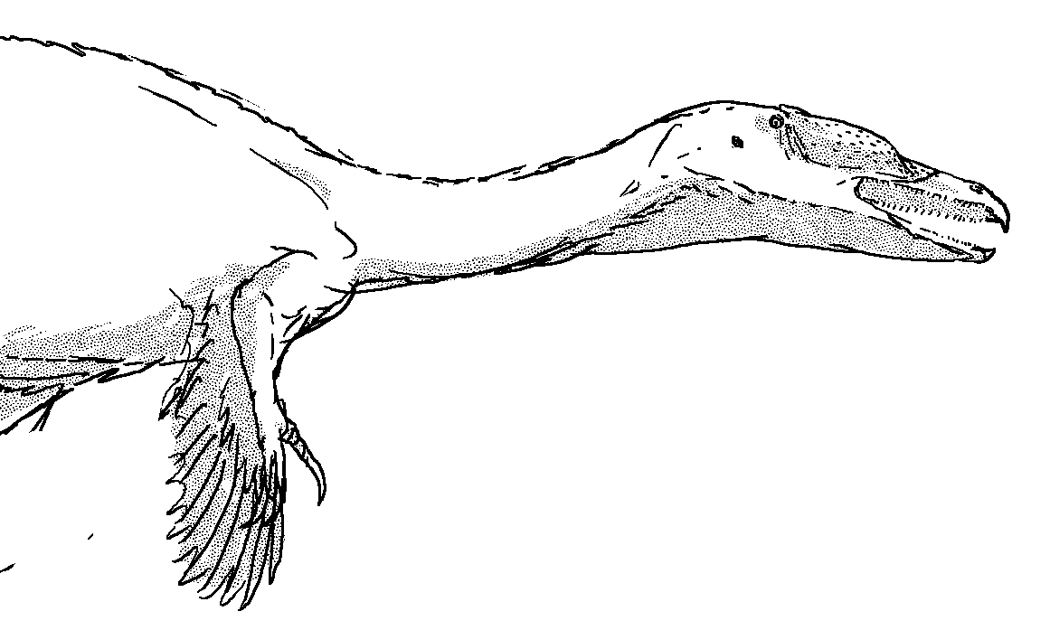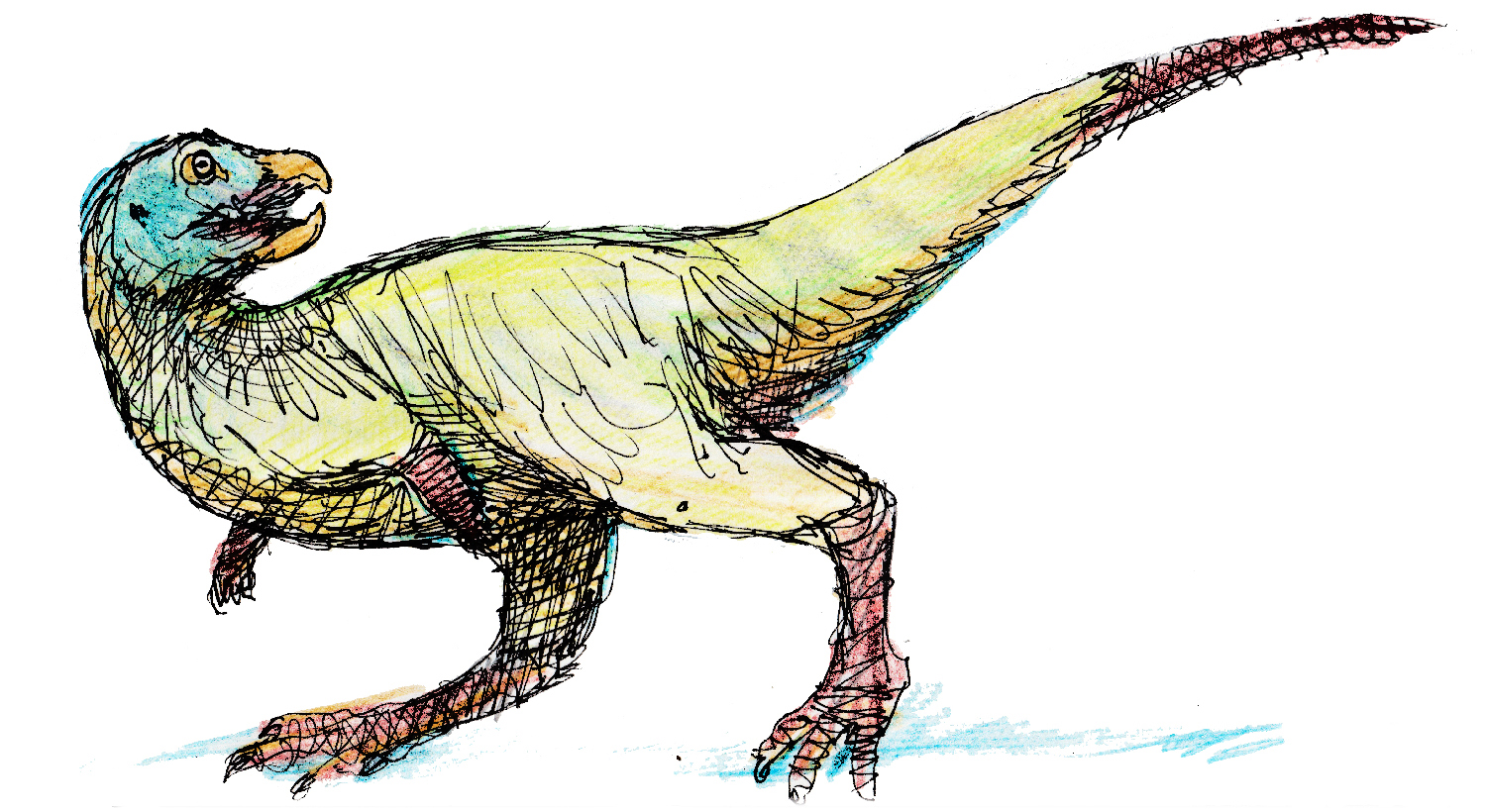 Sketch of a predatory dinosaur with a big, burly, bird-like beak. Not an actual animal, but the result of an exercise in speculative evolution.