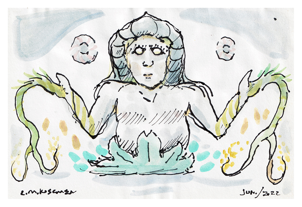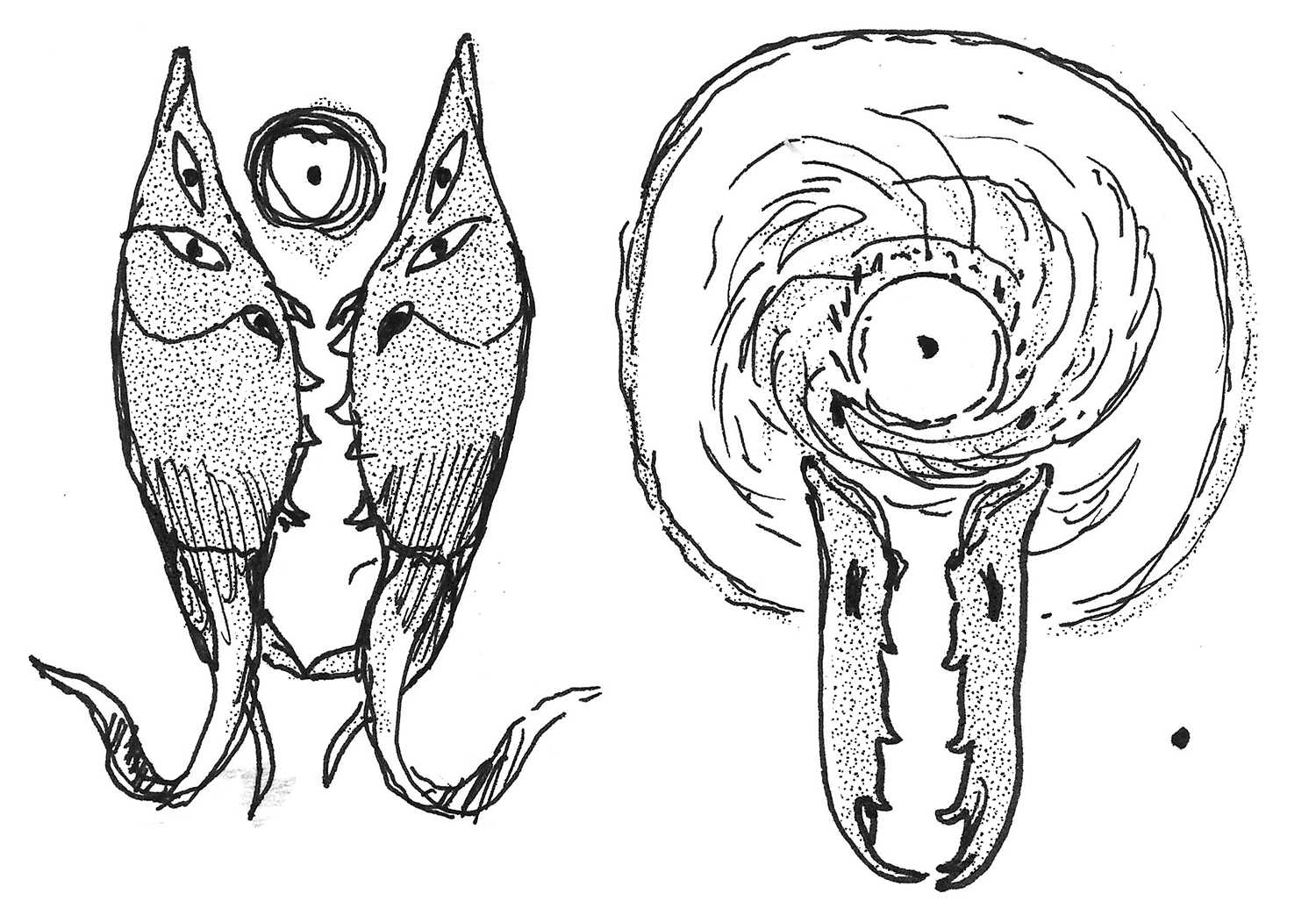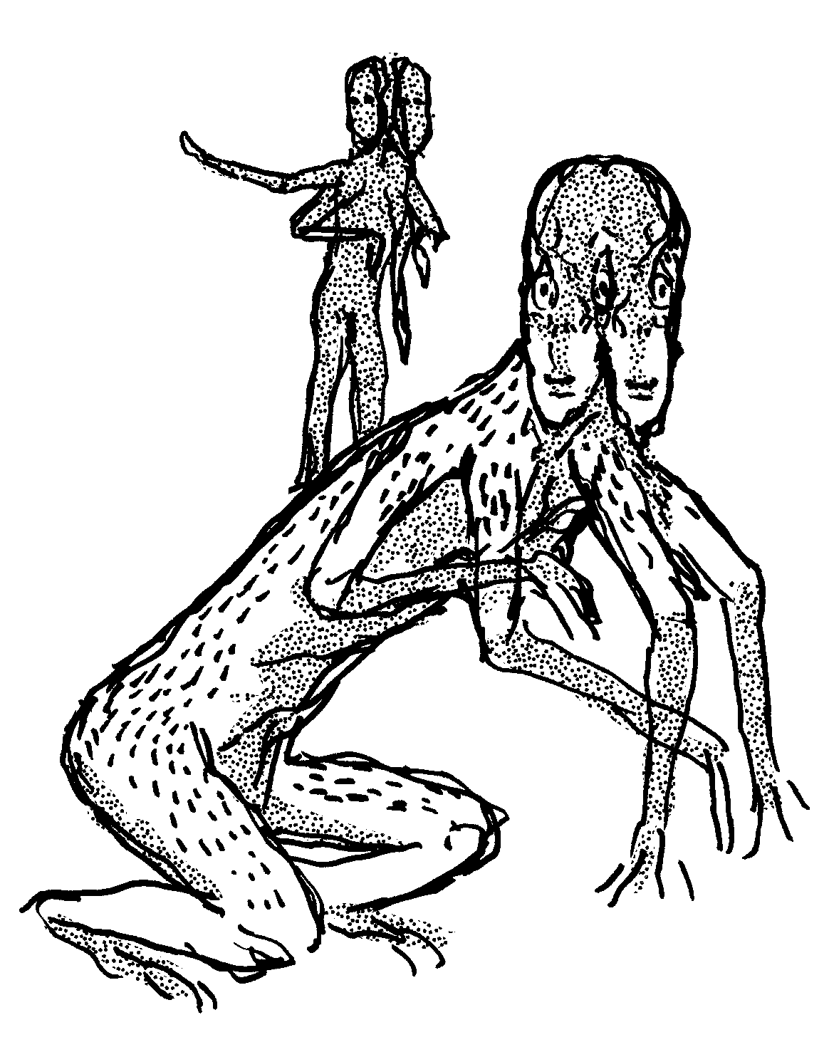 Sketch of two embracing snake creatures.