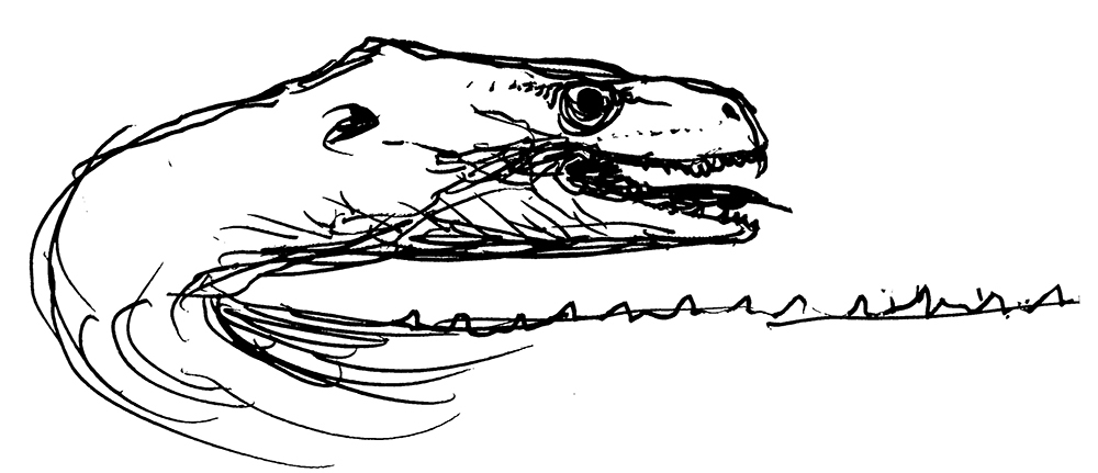 Sketch of a beaked, sea-serpent-like marine animal, the result of an exercise in speculative evolution.