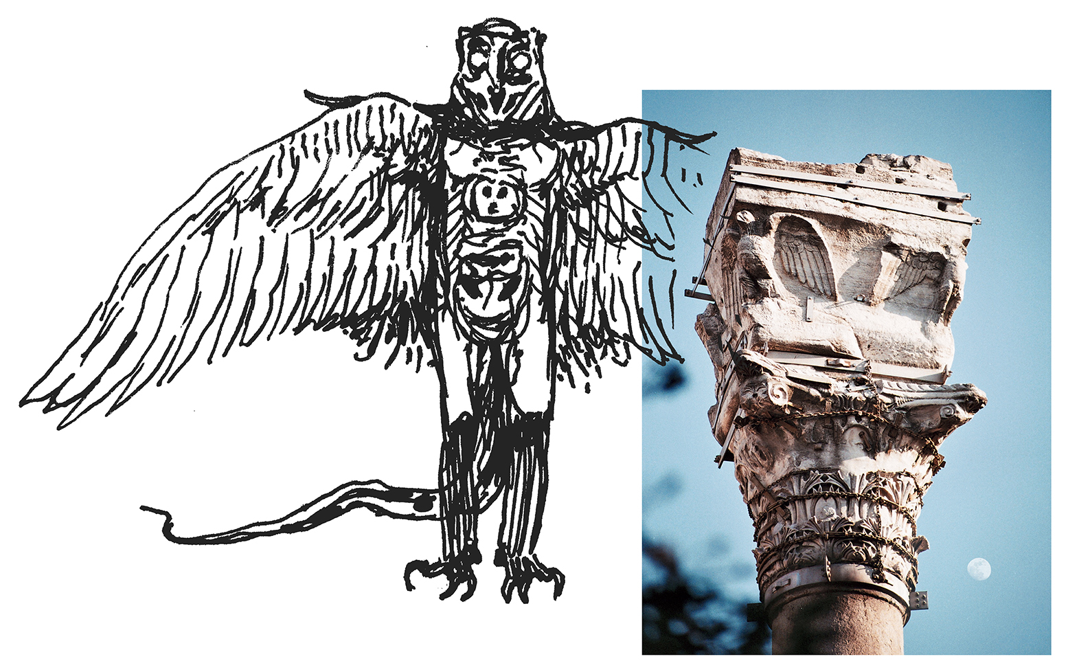 Symbolic sketches of a flying bird, and an eagle monument.