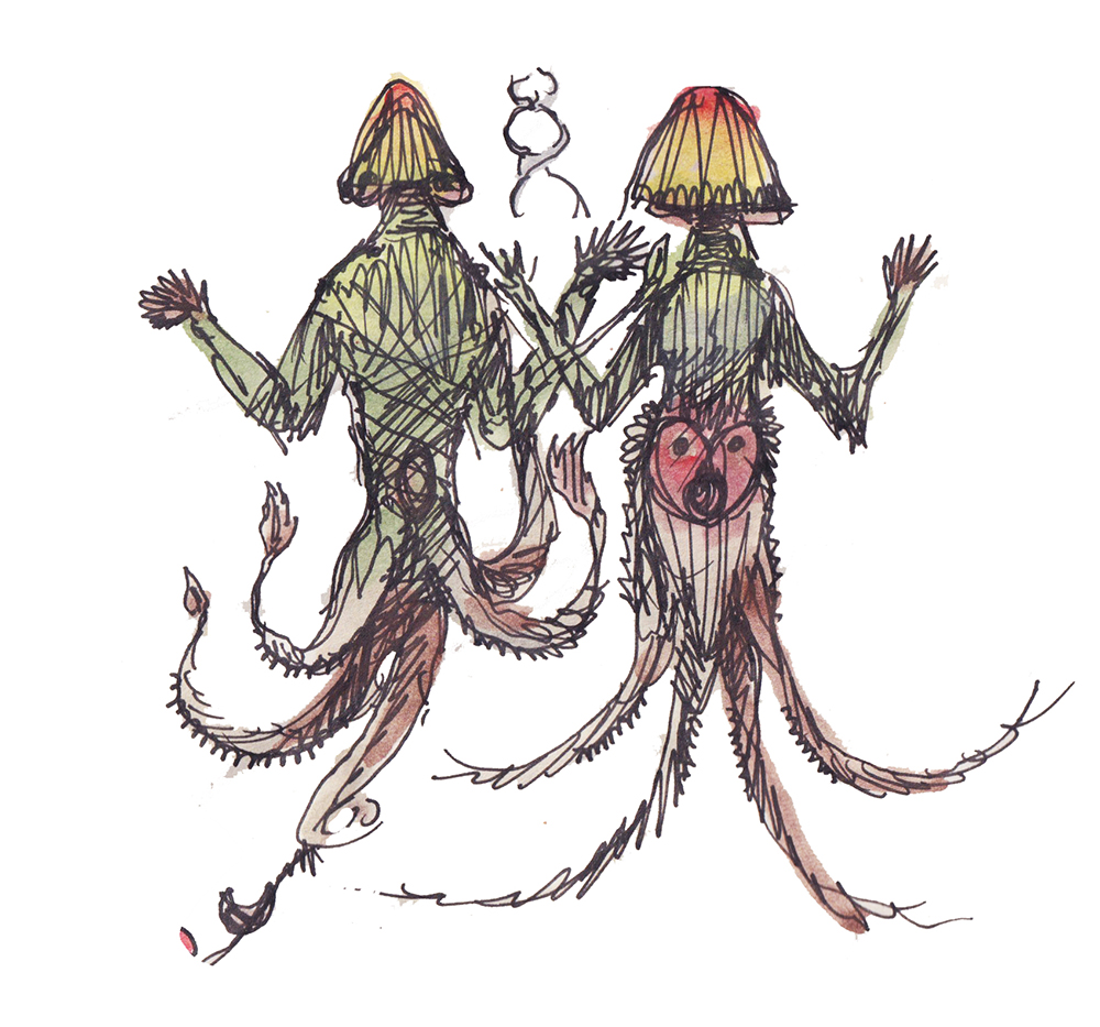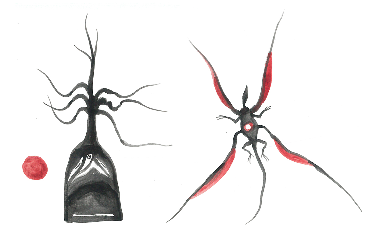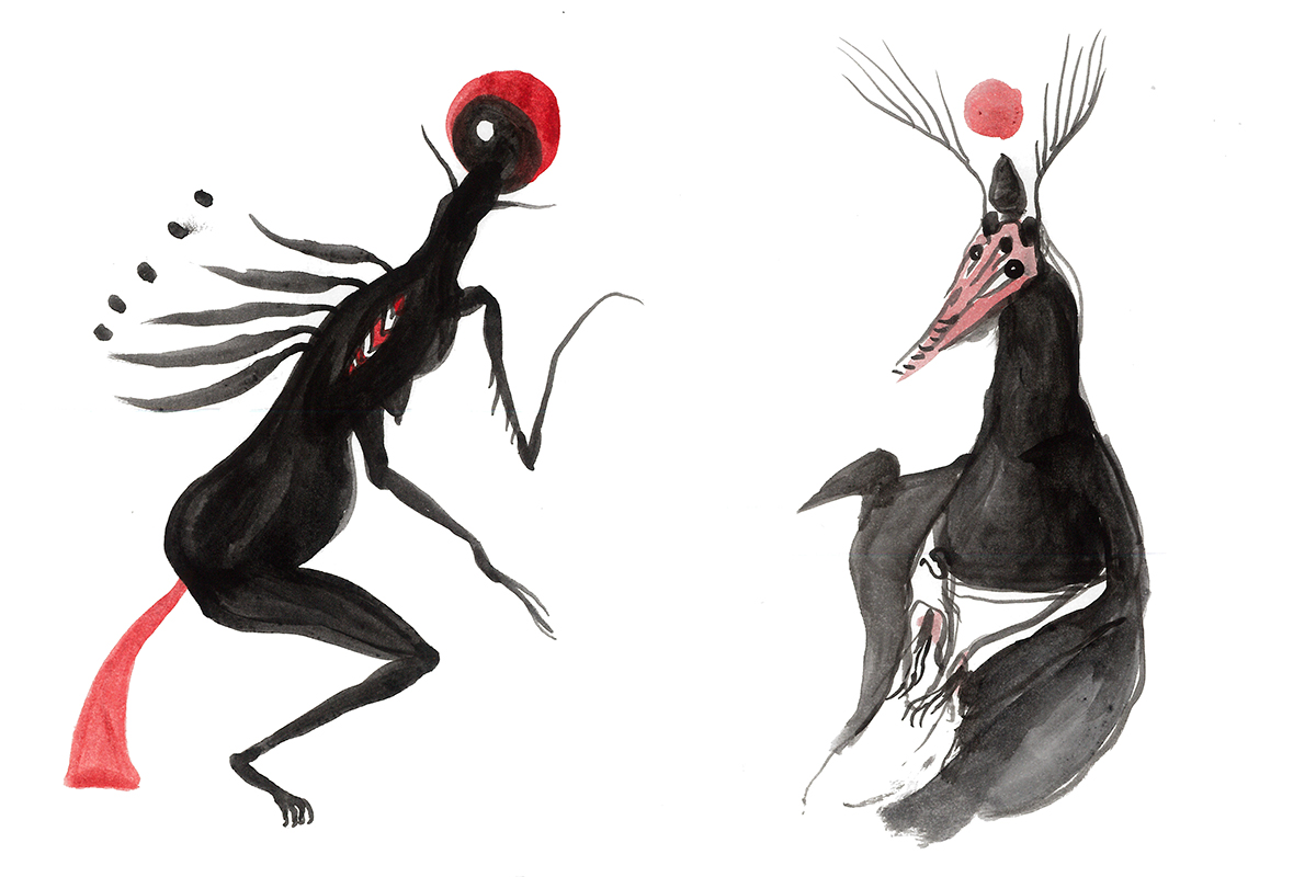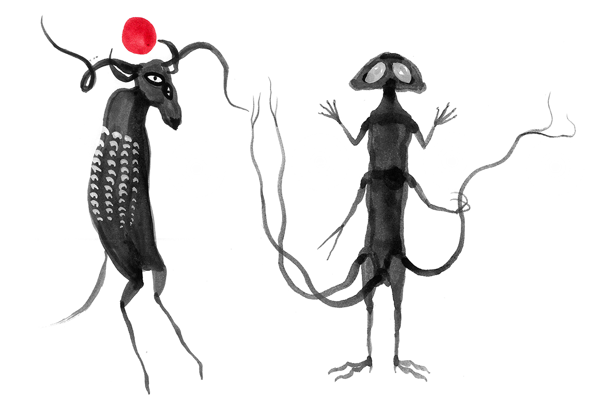 Pencil sketches of two spirit-creatures.