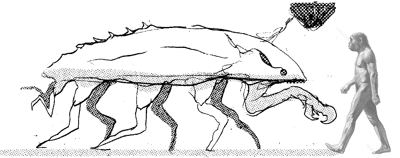 Sketches of Metautarops and Pseudosymmetrognathus, oversize arthropods that evolved rodent-like bod yplans. These are not real animals, but products of an exercise in speculative evolution.