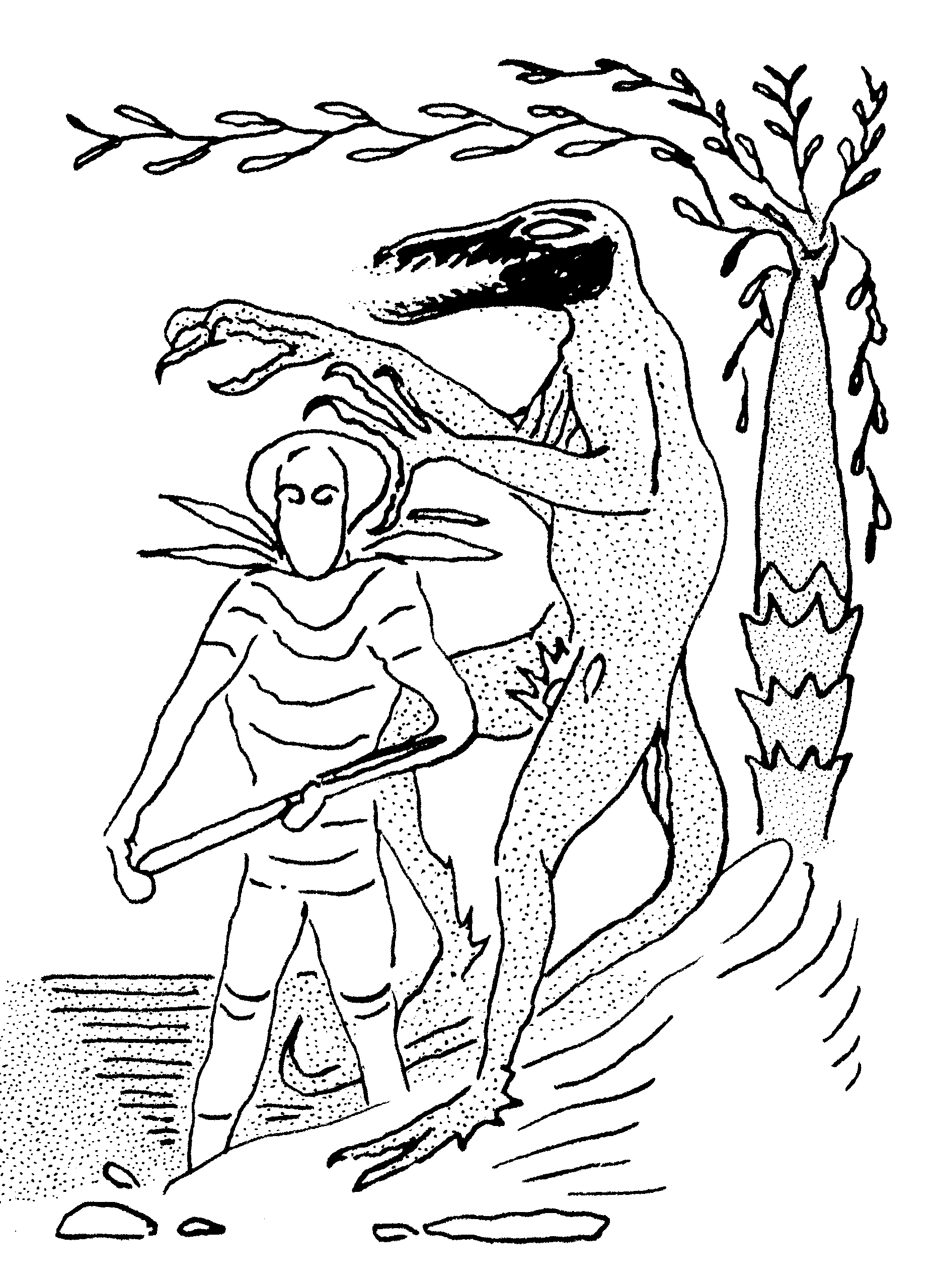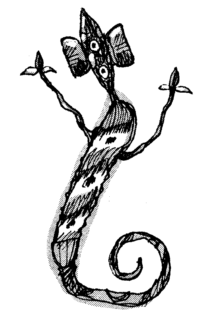 Sketches of an oracular tree; and the giant, club-wielding monster that guards it. Concepts from a sci-fi scenario.