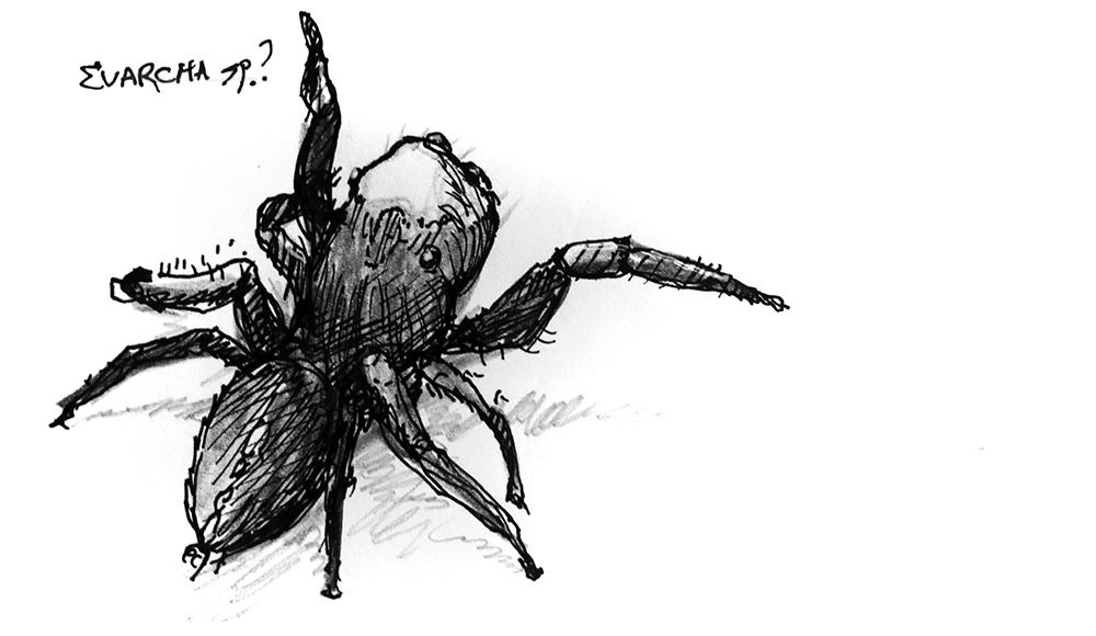 Sketch of a giant spider that has evolved from regular ancestors on a low-gravity alien planet. The result of an exercise in speculative evolution.