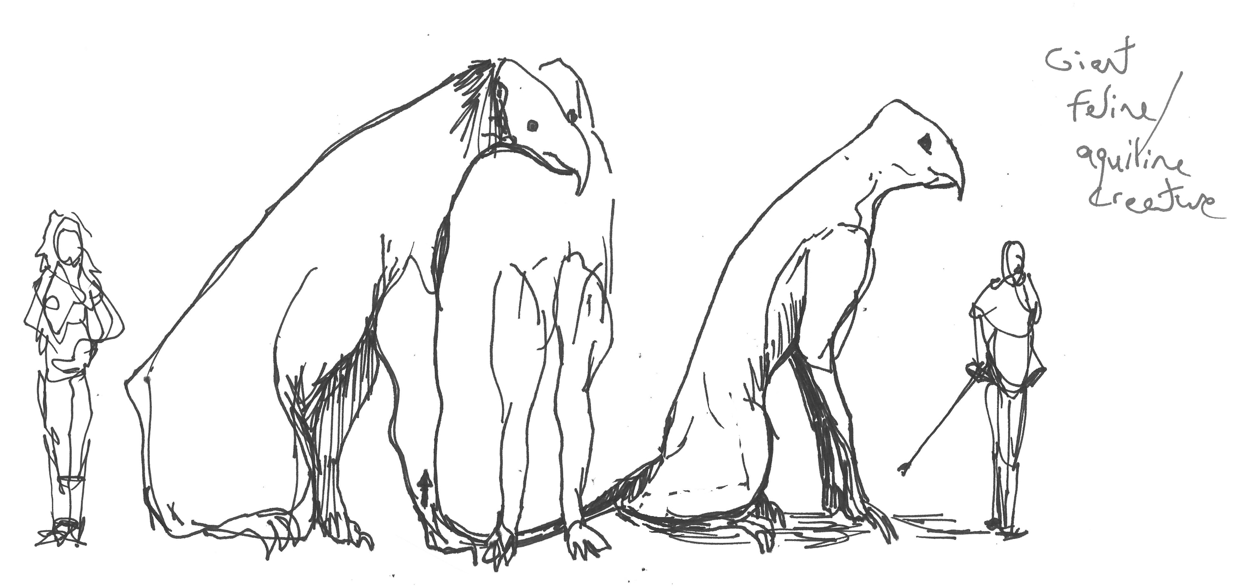 Sketches of two giant feline / aquiline creatures, in scale with human figures.