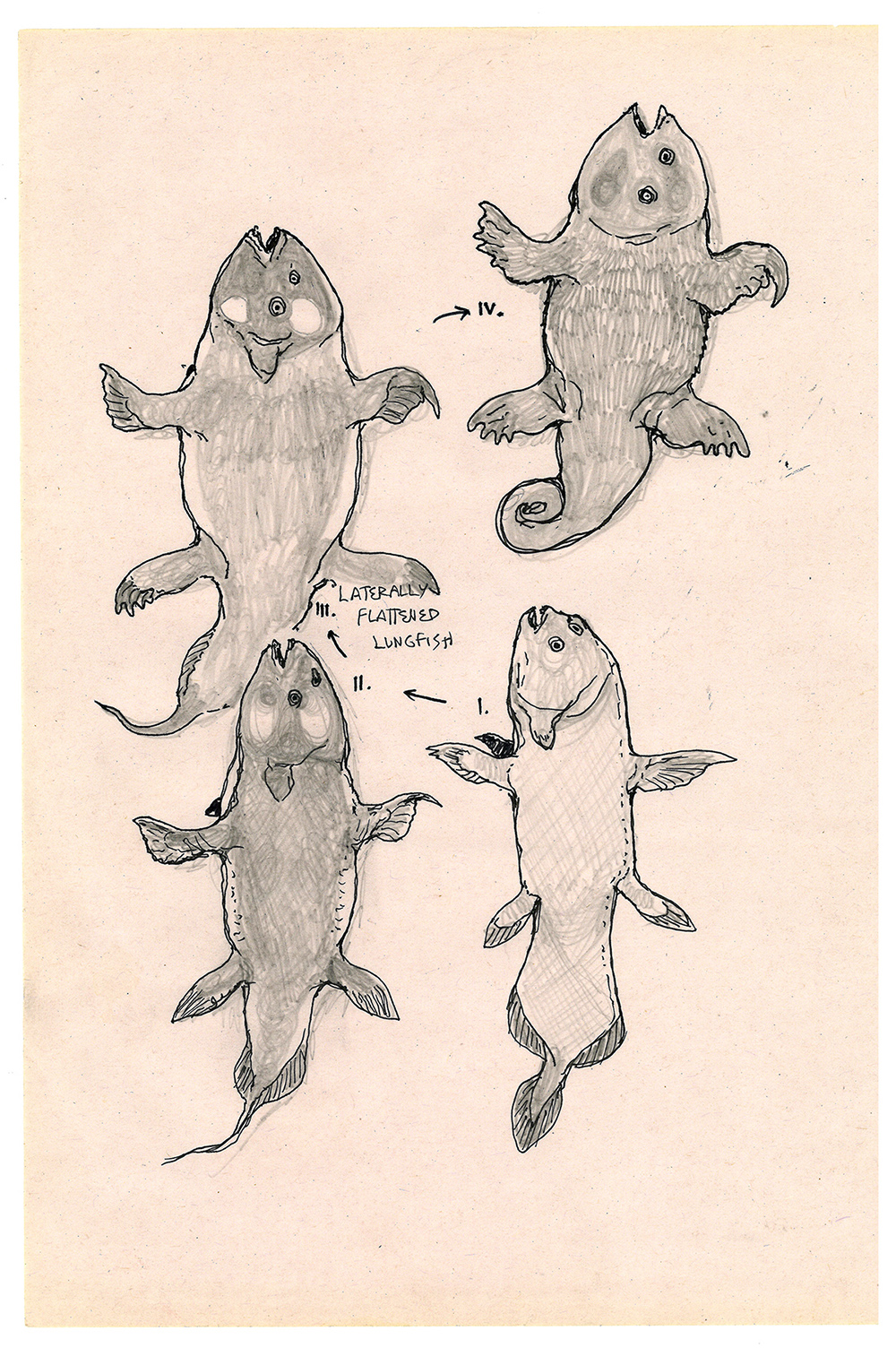 Sketches chronicling the evolution of "flat amphibians" from a lineage of laterally-flattened lungfish.