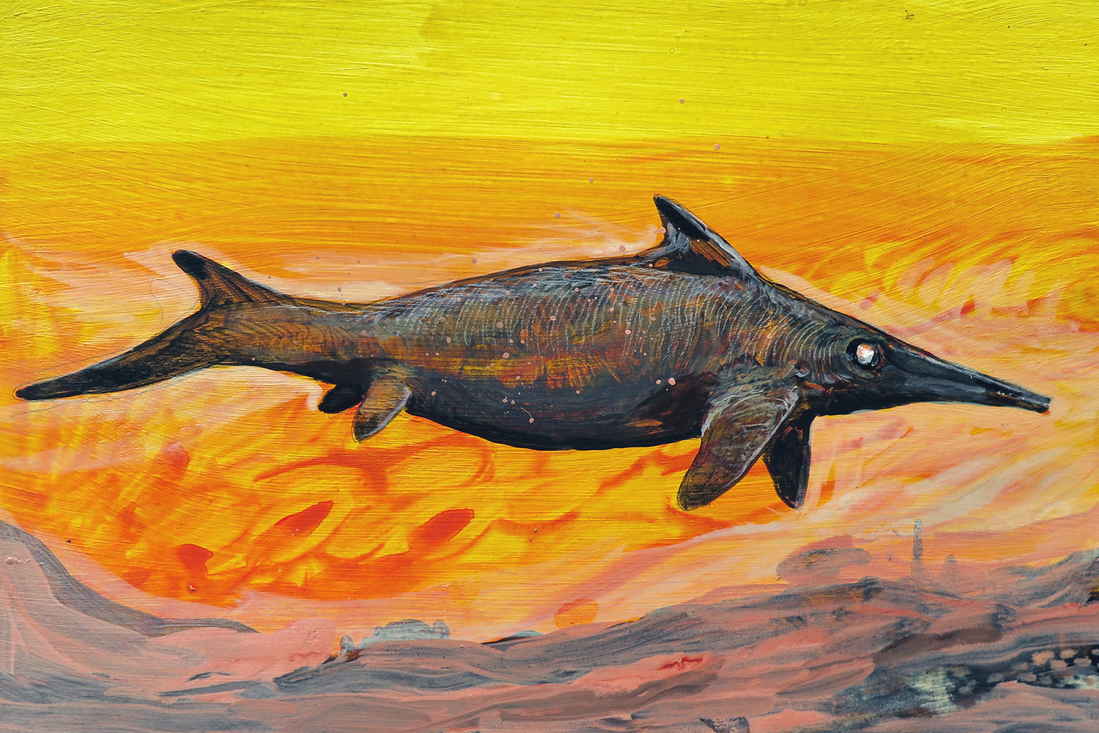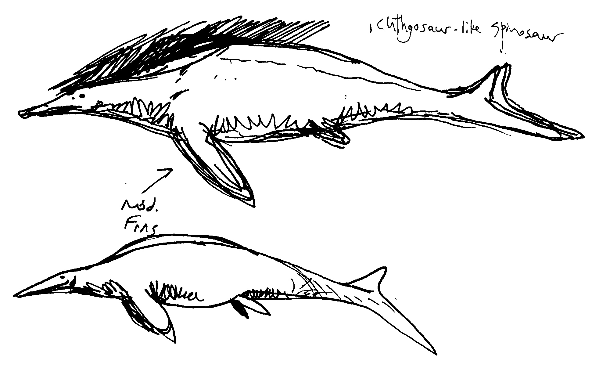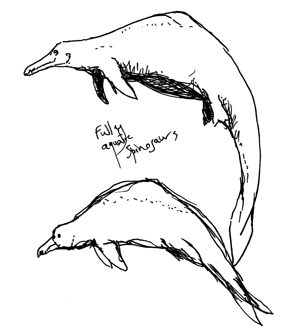 Sketch of fully-aquatic predatory dinosaurs evolved from spinosaurs.