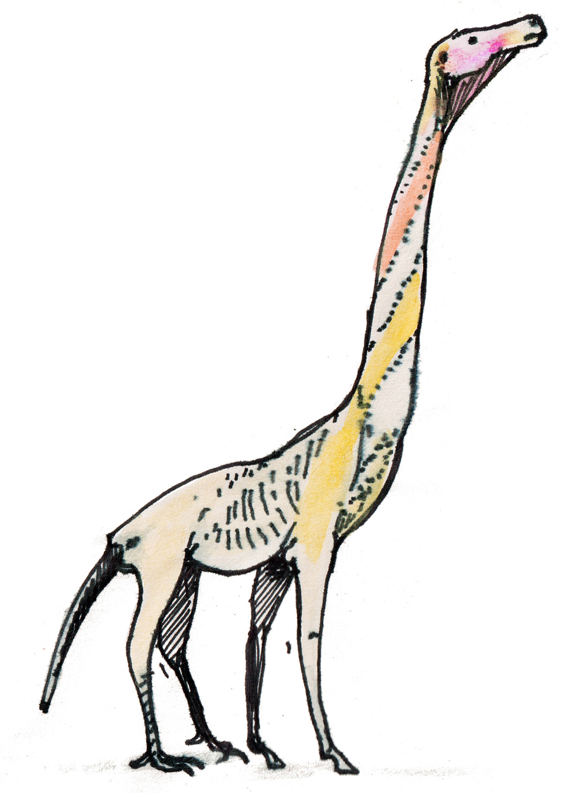 Sketches of three sauropod dinosaurs. From left to right, they are Brachiosaurus, Mamenchisaurus and Camarasaurus. I examined x-rays of extant long-necked birds and experimented with a style of reconstruction where I drew the neck very thick at the point it joins the body, and then immediately gets slimmer in order to conserve weight.