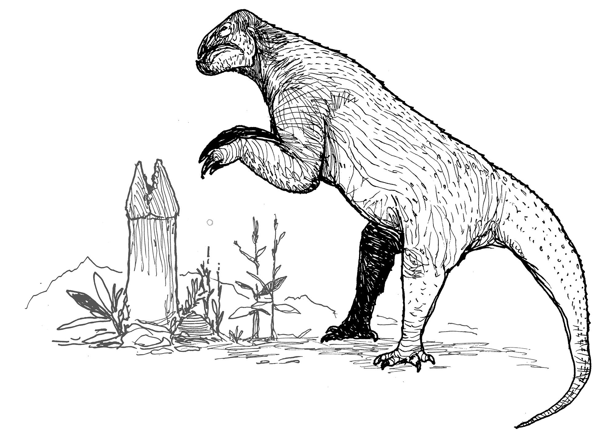 Sketch of a Plateosaurus dinosaur near ancient ruins built by a lost civilization of Lystrosaurus-like creatures. Ink drawing over Midjourney-generated collage.