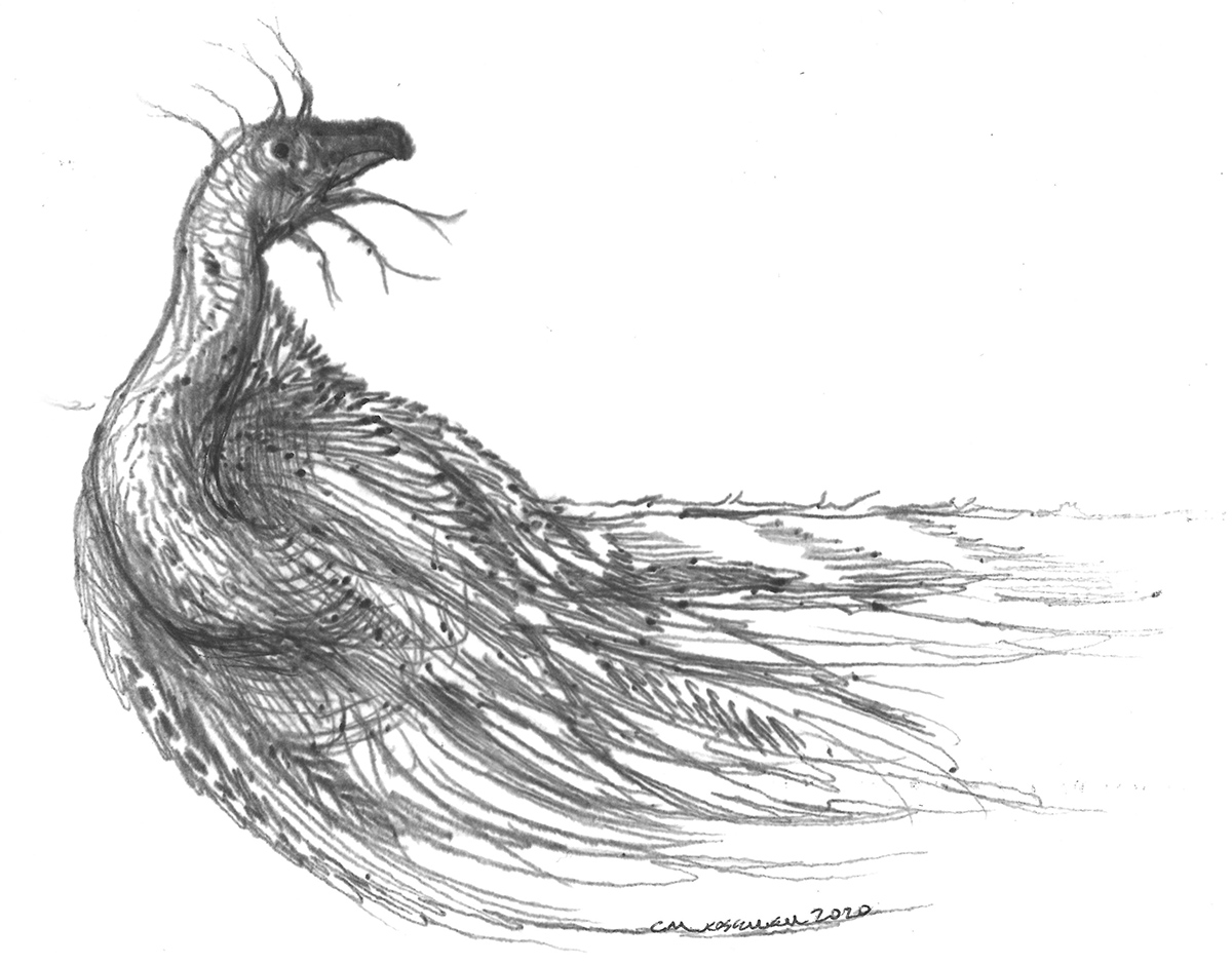 Sketched of a crested, bird-like creature; an exercise in speculative evolution.