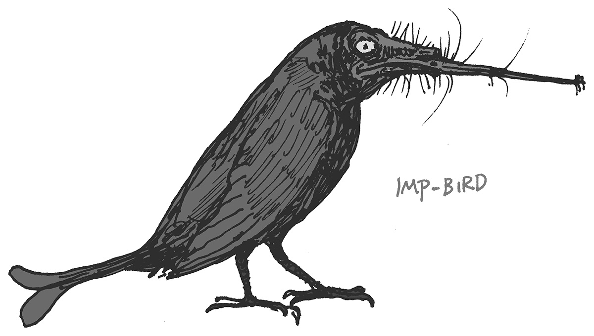Sketch of a zygodactyl "imp bird", a parasitic flyer that evolved from early avian ancestors. Not a real animal, but an exercise in speculative evolution.