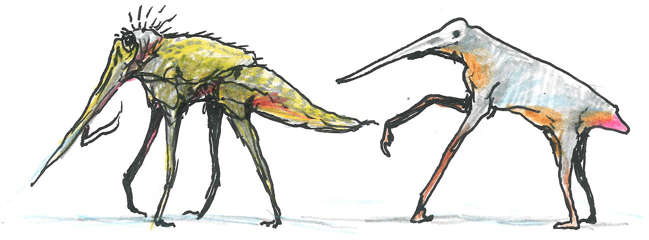 Unreferenced sketches of "doofus pterosaurs", silly-looking prehistoric flying reptiles.