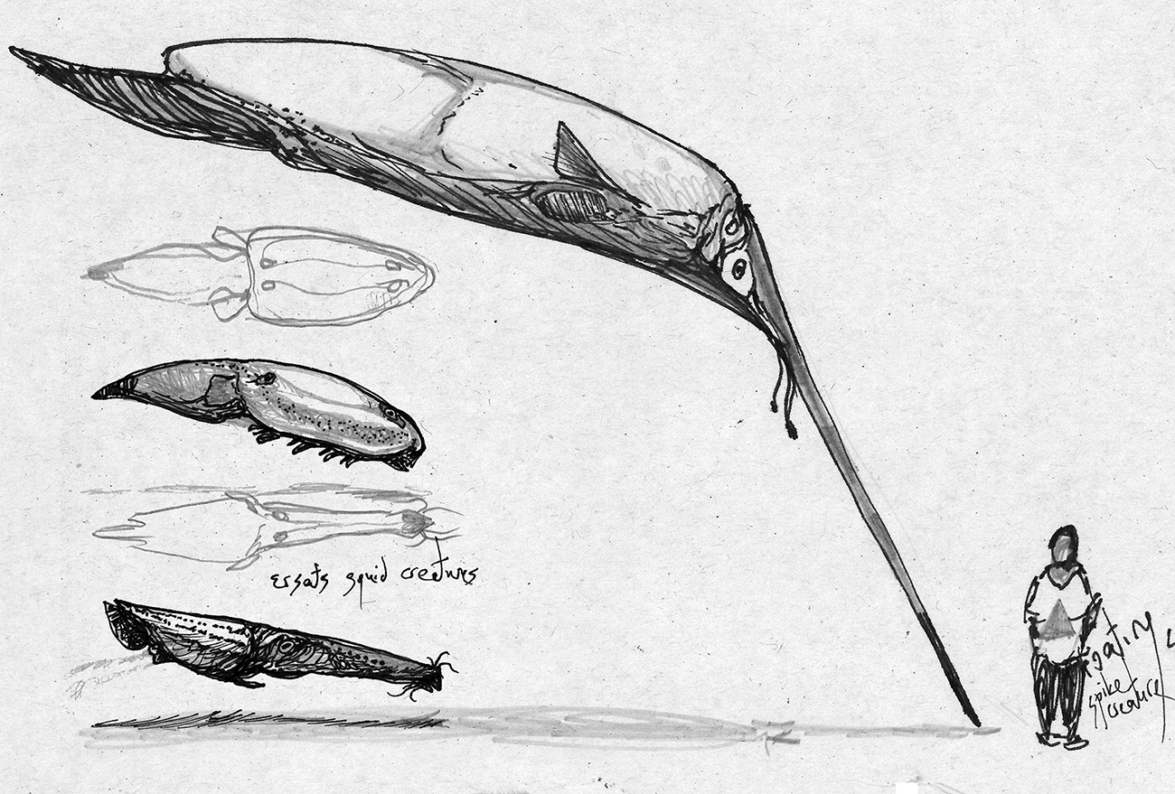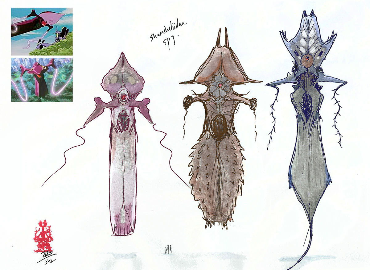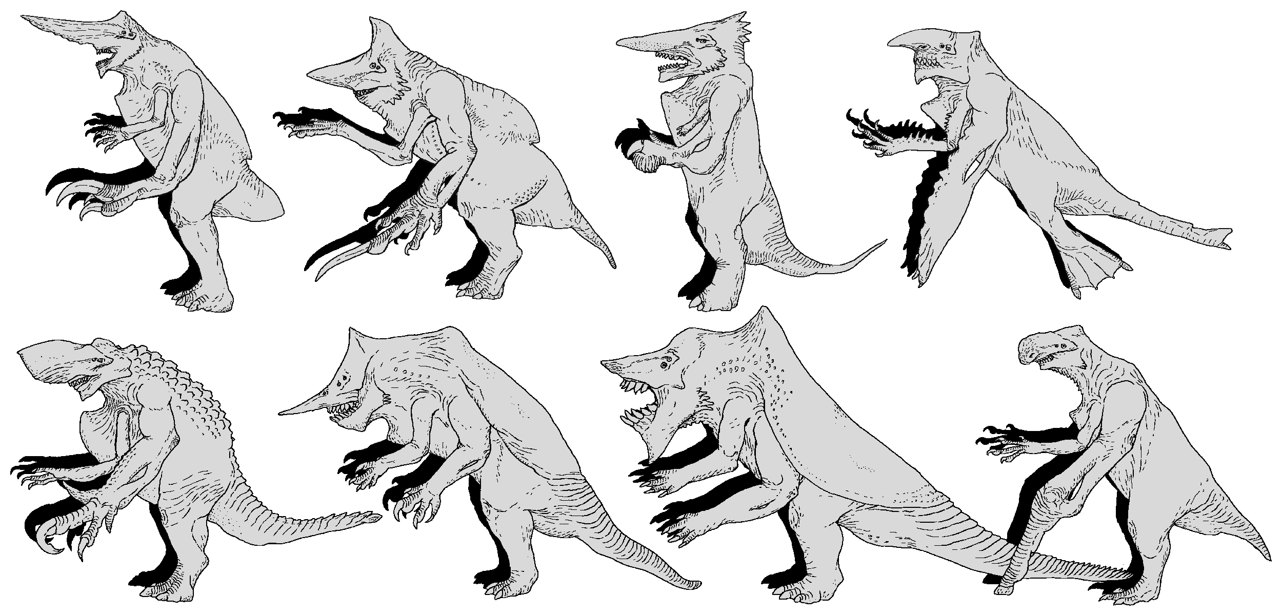 Sketches of creatures derived from the kaiju monsters in the Pacific Rim film series.