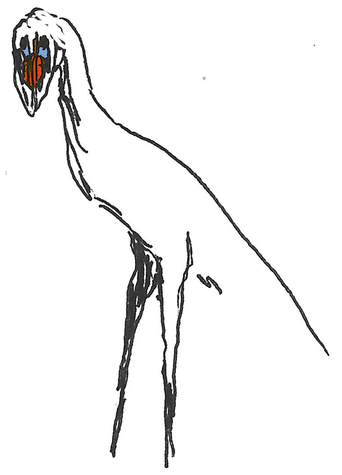 Sketch of a "Samasilam birdman", a bird-related sophont creature with a blade-like, dextrous lower jaw. Not a real animal, but an exercise in speculative evolution.