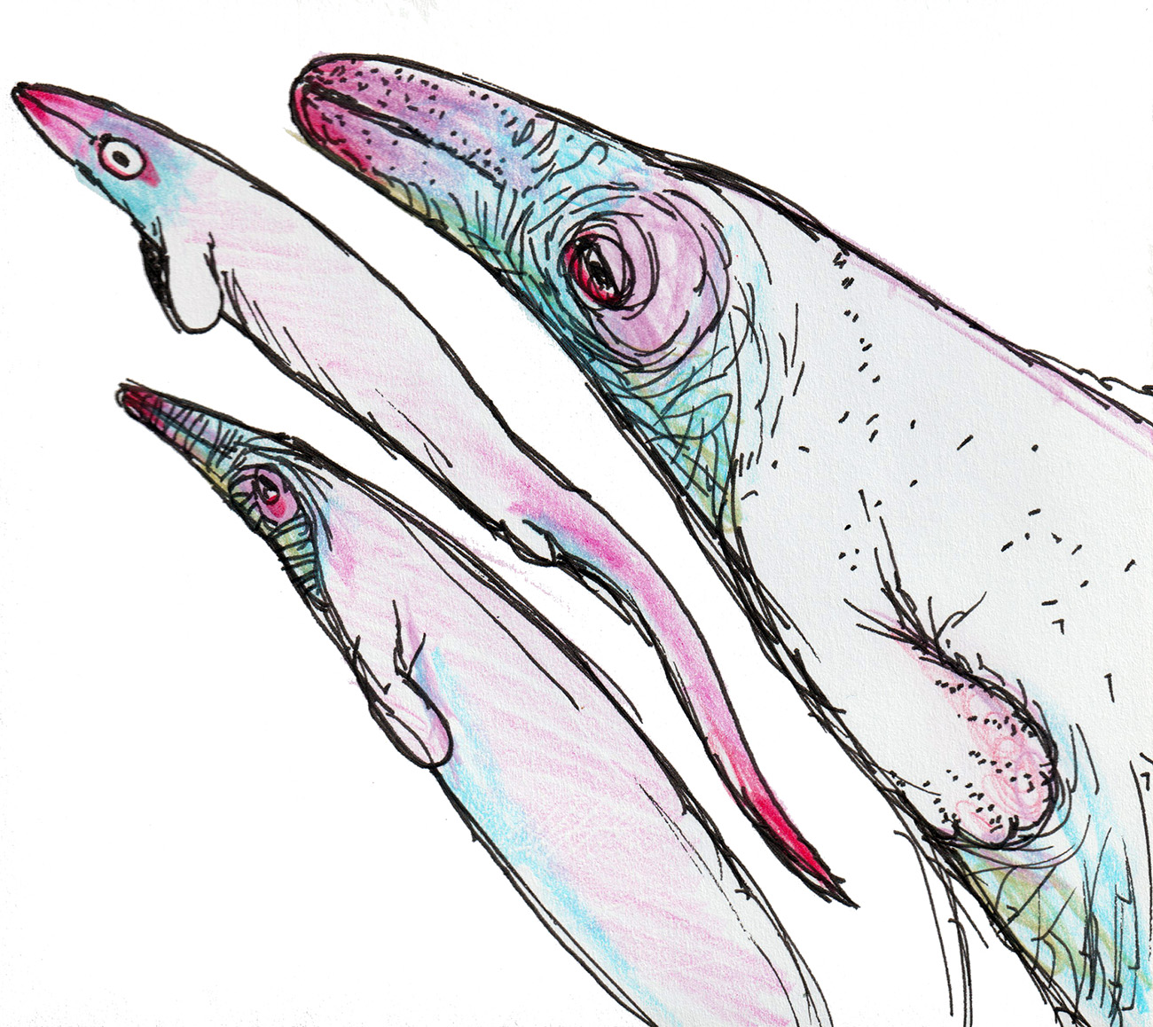 Sketches of "bridge-neck skimmer creatures", marine reptiles with unique specialisations to skim-feed on small, surface-dwelling fish. Not real animals, but instead the results of an exercise in speculative evolution.