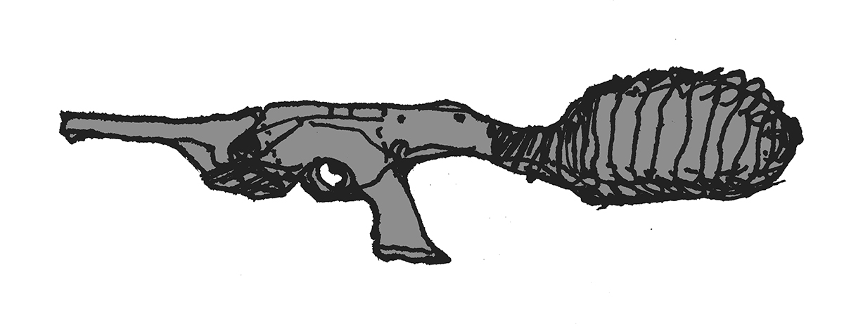 Sketch of a machine pistol produced from bone-like organic parts.